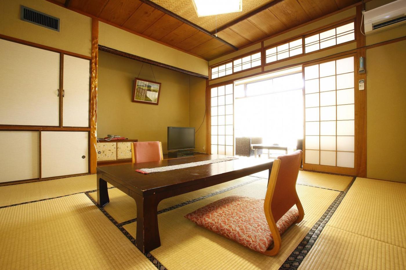 Japanese-Style Triple Room. The triple room provides air conditioning, tatami, as well as a shared bathroom featuring a hairdryer and slippers. The triple room features a tea and coffee maker, a safe deposit box, yukata, heating, as well as a TV. The unit offers 3 futons. ;