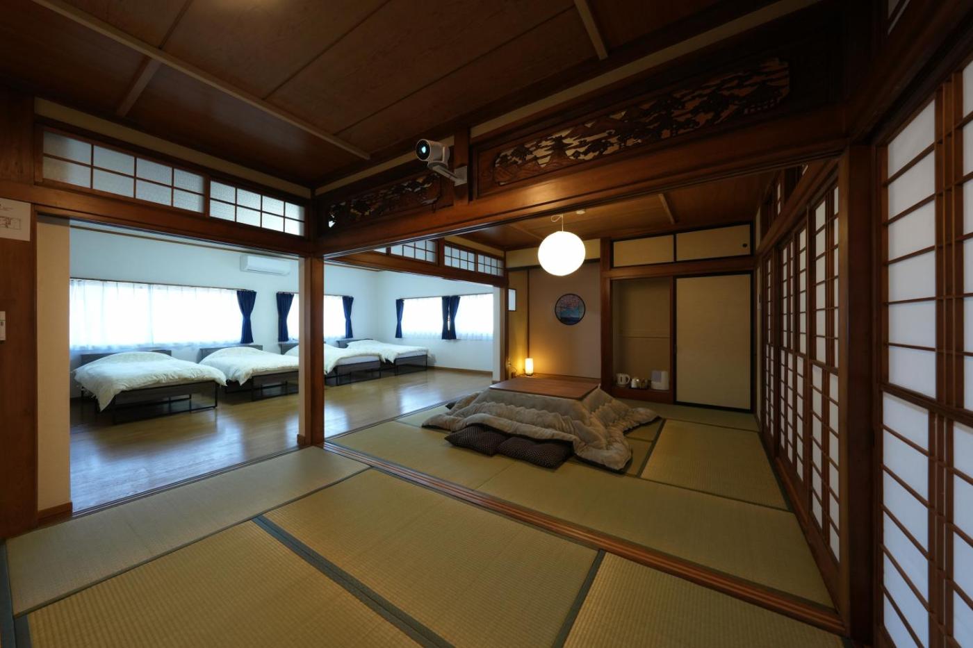 Two-Bedroom Villa. Boasting a private entrance, this air-conditioned villa comes with 1 living room, 2 separate bedrooms and 1 bathroom with a bath and a shower. In the well-equipped kitchen, guests will find a stovetop, a refrigerator, kitchenware and a microwave. The spacious villa features a washing machine, tatami, a tea and coffee maker, a flat-screen TV with streaming services, as well as ancourtyard view. The unit has 9 beds and 2 futons.