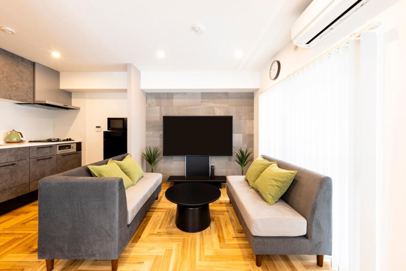 Two-Bedroom Apartment. The well-equipped kitchen has a refrigerator, a microwave and an electric kettle. This apartment features air conditioning, a washing machine, a flat-screen TV with streaming services and a balcony. The unit offers 2 beds.