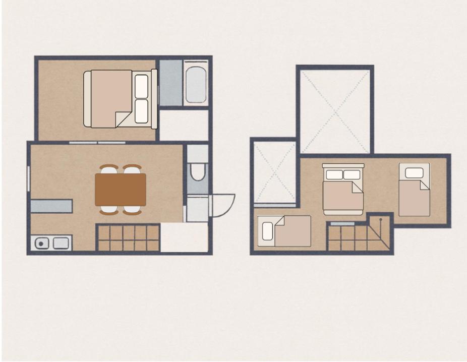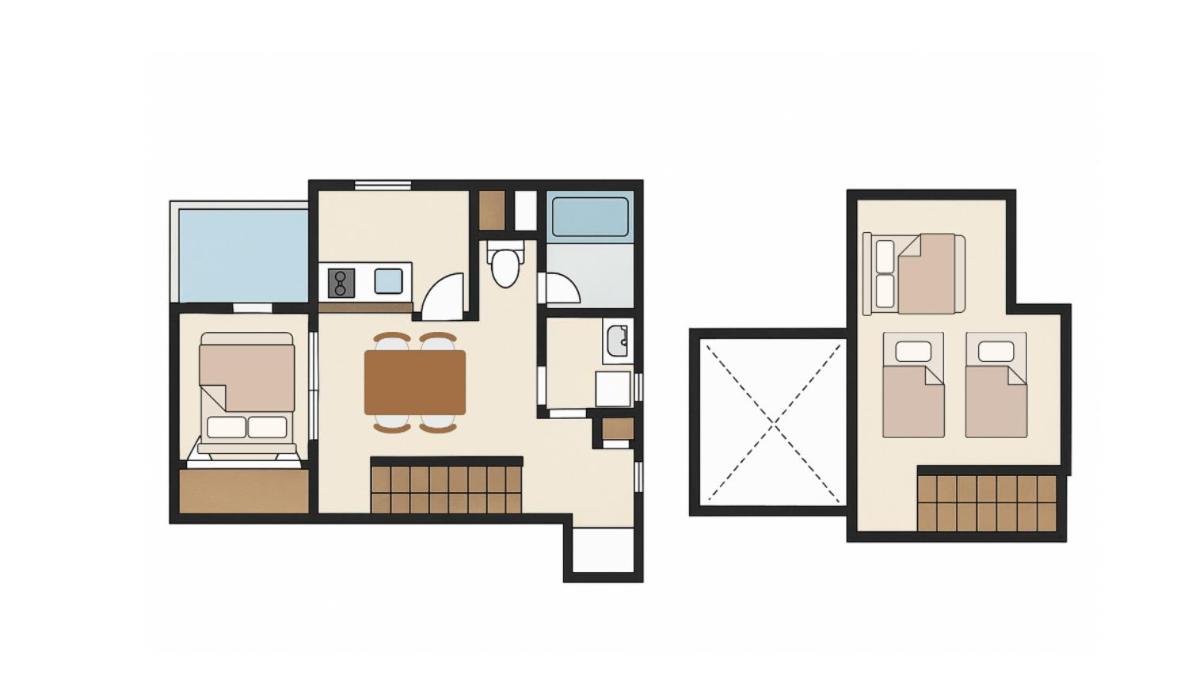 Two-Bedroom Loft Apartment. This apartment comes with 1 living room, 2 separate bedrooms and 1 bathroom with a bath and free toiletries. The well-fitted kitchen has a stovetop, a refrigerator, kitchenware and a microwave. This apartment is air-conditioned and features a washing machine, a dining area as well as a balcony. The unit has 1 bed and 3 futons.