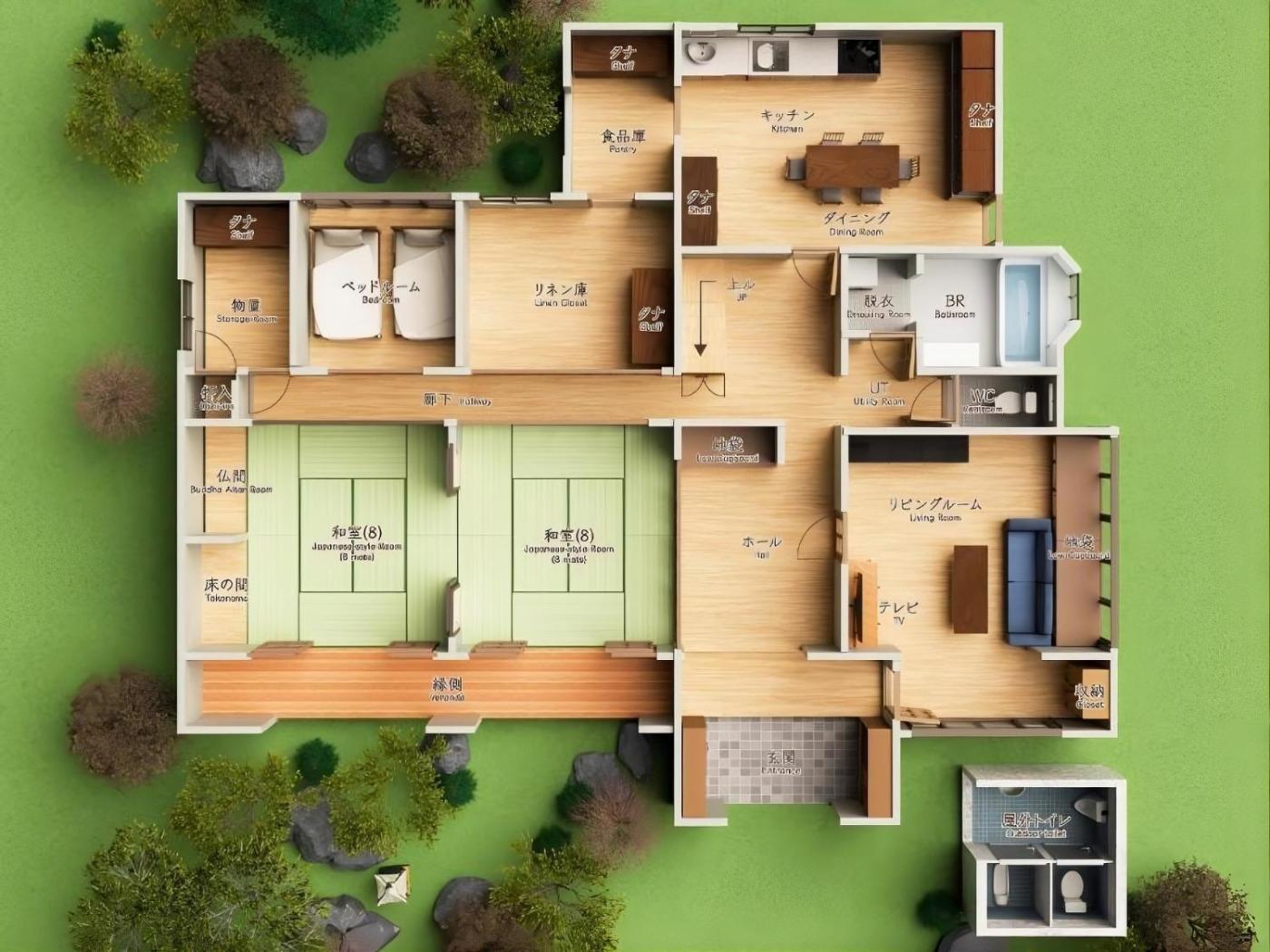 Villa. This villas standout feature is the hot tub. Boasting a private entrance, this air-conditioned villa includes 1 living room, 3 separate bedrooms and 1 bathroom with a bath and a shower. Guests will find a stovetop, a refrigerator, kitchenware and a microwave in the fully equipped kitchen. The villa also features a barbecue. The villa offers a washing machine, tatami, a tea and coffee maker, a flat-screen TV with streaming services, as well as garden views. The unit has 3 beds and 6 futons.