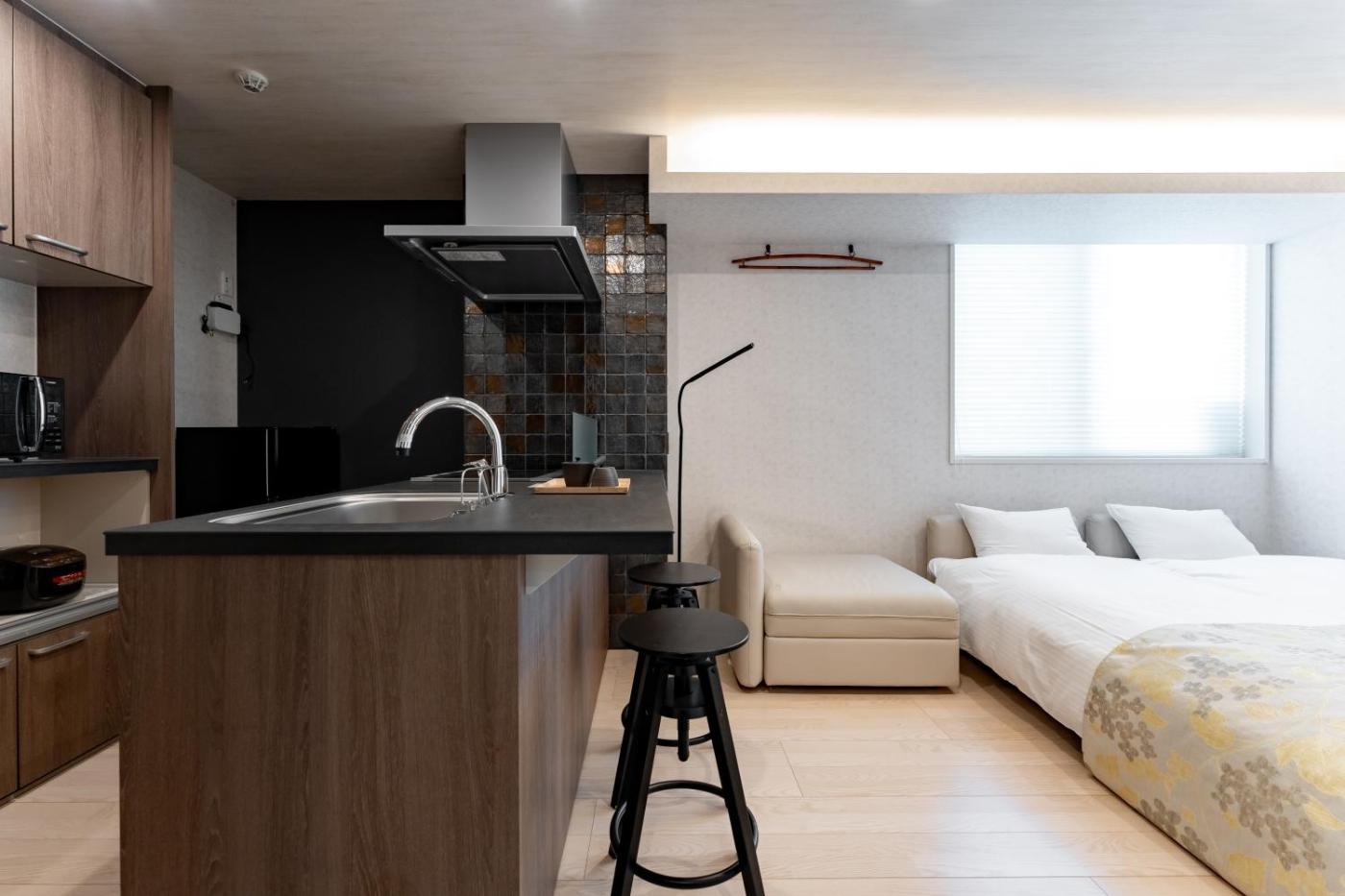 One-Bedroom Apartment. This apartment is comprised of 1 living room, 1 separate bedroom and 1 bathroom with a bath and free toiletries. The well-fitted kitchen has a stovetop, a refrigerator, kitchenware and a microwave. This apartment is air-conditioned and features a flat-screen TV, a washing machine, a tea and coffee maker and a dining area. The unit offers 2 beds and 2 futons.