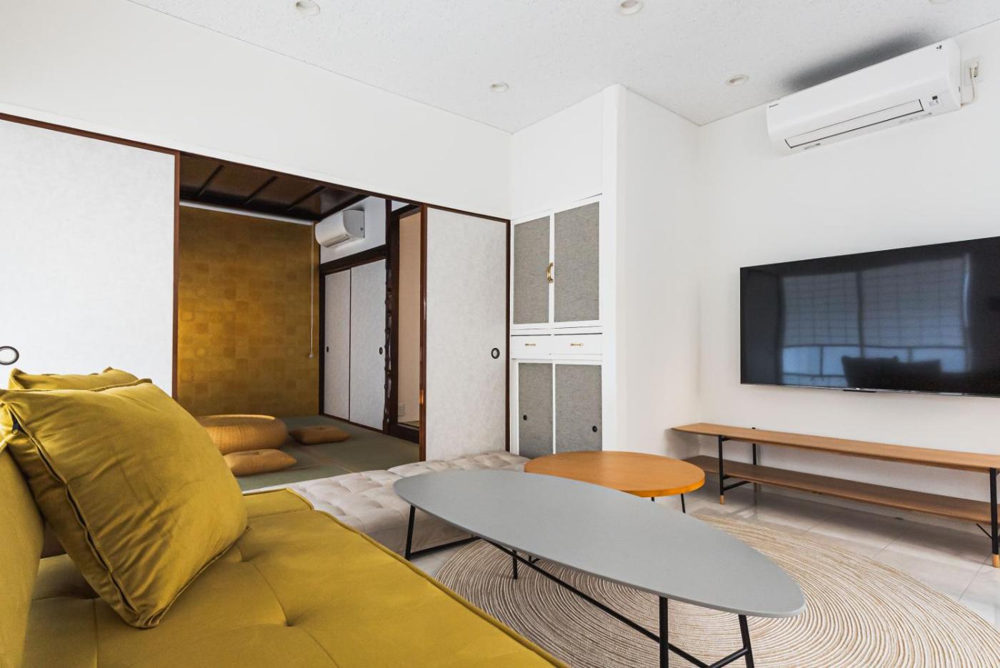Three-Bedroom Apartment. This spacious apartment features 3 bedrooms, a kitchen and 1 bathroom with a bath and a shower. The fully equipped kitchen has a stovetop, a refrigerator, kitchenware and an oven. The air-conditioned apartment features a flat-screen TV, a washing machine, tatami, a tea and coffee maker as well as a quiet street view. The unit has 6 beds and 3 futons.