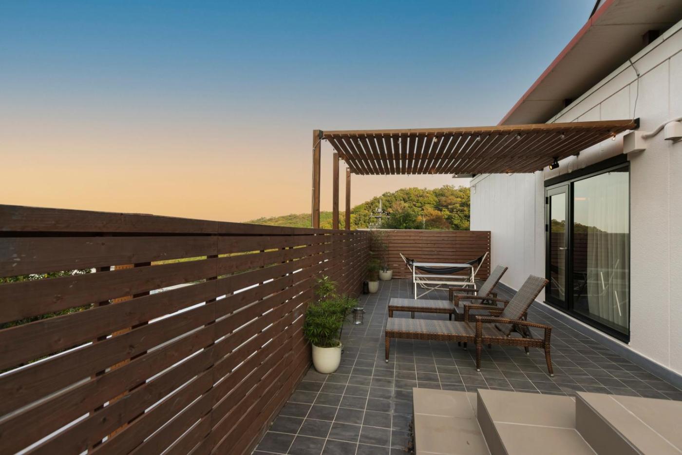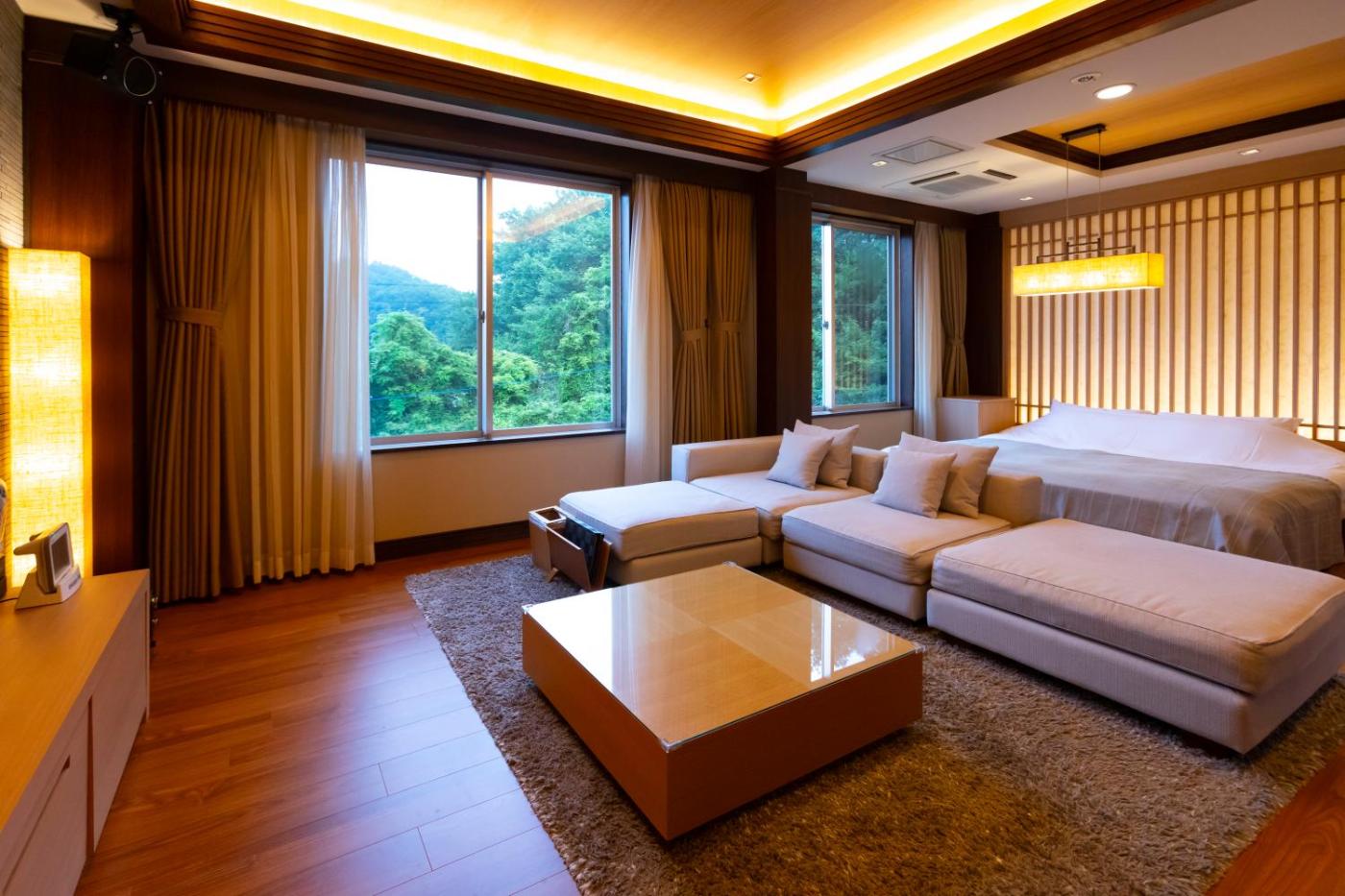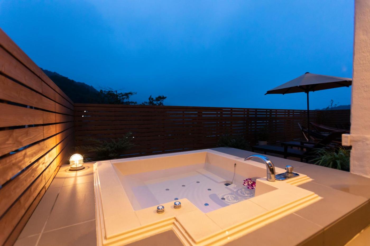 King Room with Balcony. This double rooms standout feature is the private open-air bath. Offering free toiletries and bathrobes, this double room includes a private bathroom with a bath, a shower and a bidet. The spacious air-conditioned double room offers a flat-screen TV with streaming services, a private entrance, soundproof walls, a tea and coffee maker as well as garden views. The unit offers 2 beds.