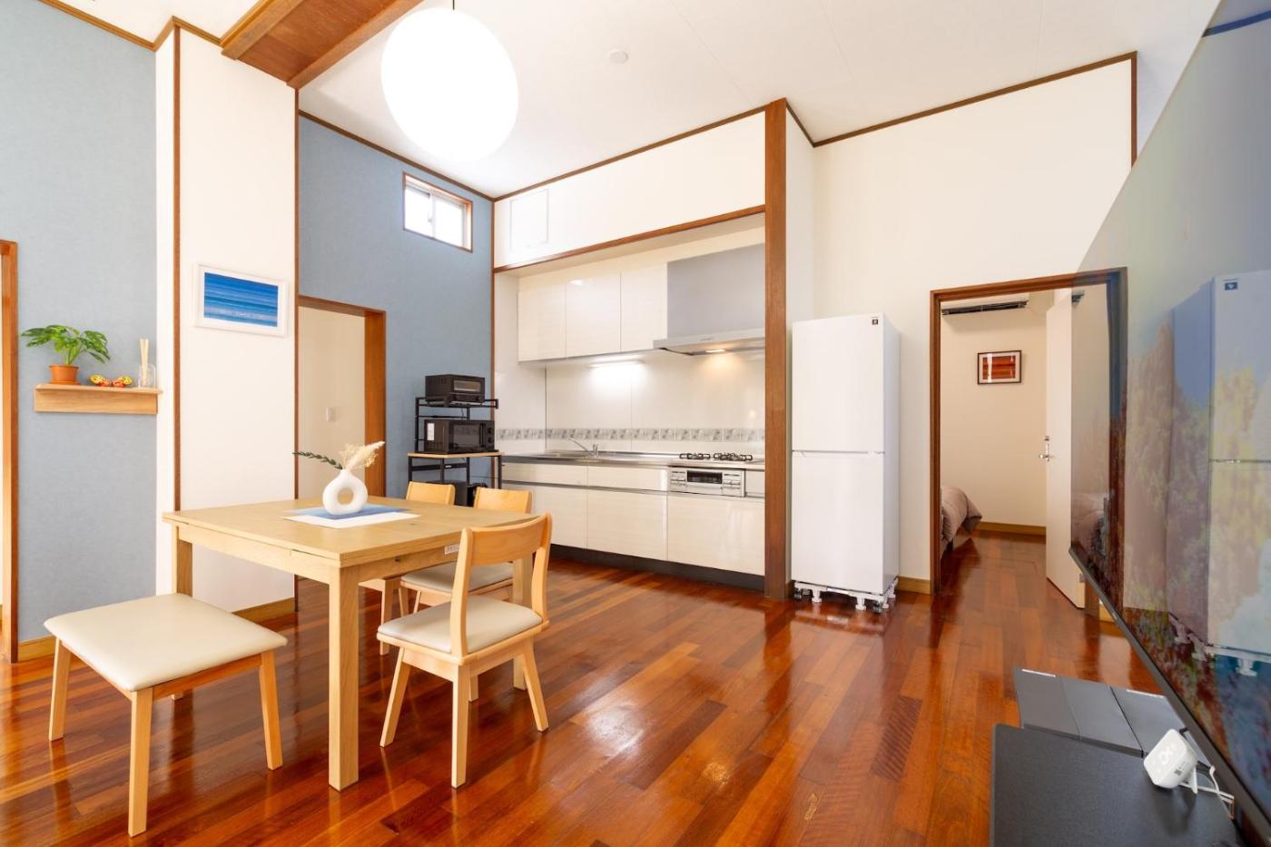 Three-Bedroom Apartment. Featuring a private entrance, this spacious apartment also is comprised of 3 separate bedrooms and 1 bathroom with a bath and a shower. In the fully equipped kitchen, guests will find a stovetop, a refrigerator, kitchenware and a microwave. The air-conditioned apartment offers a flat-screen TV with streaming services, a washing machine, tatami, a dining area as well as garden views. The unit offers 5 beds and 3 futons.