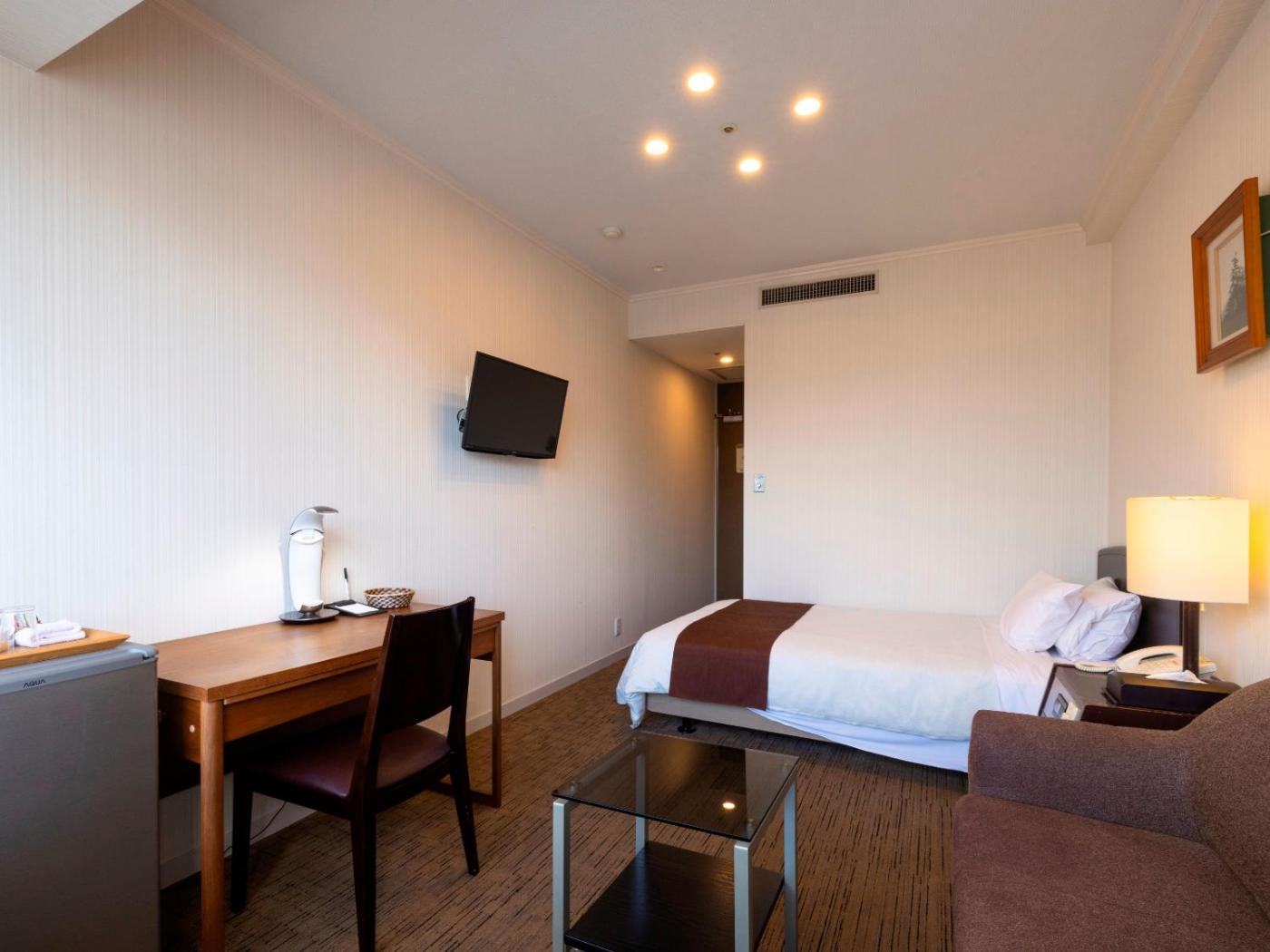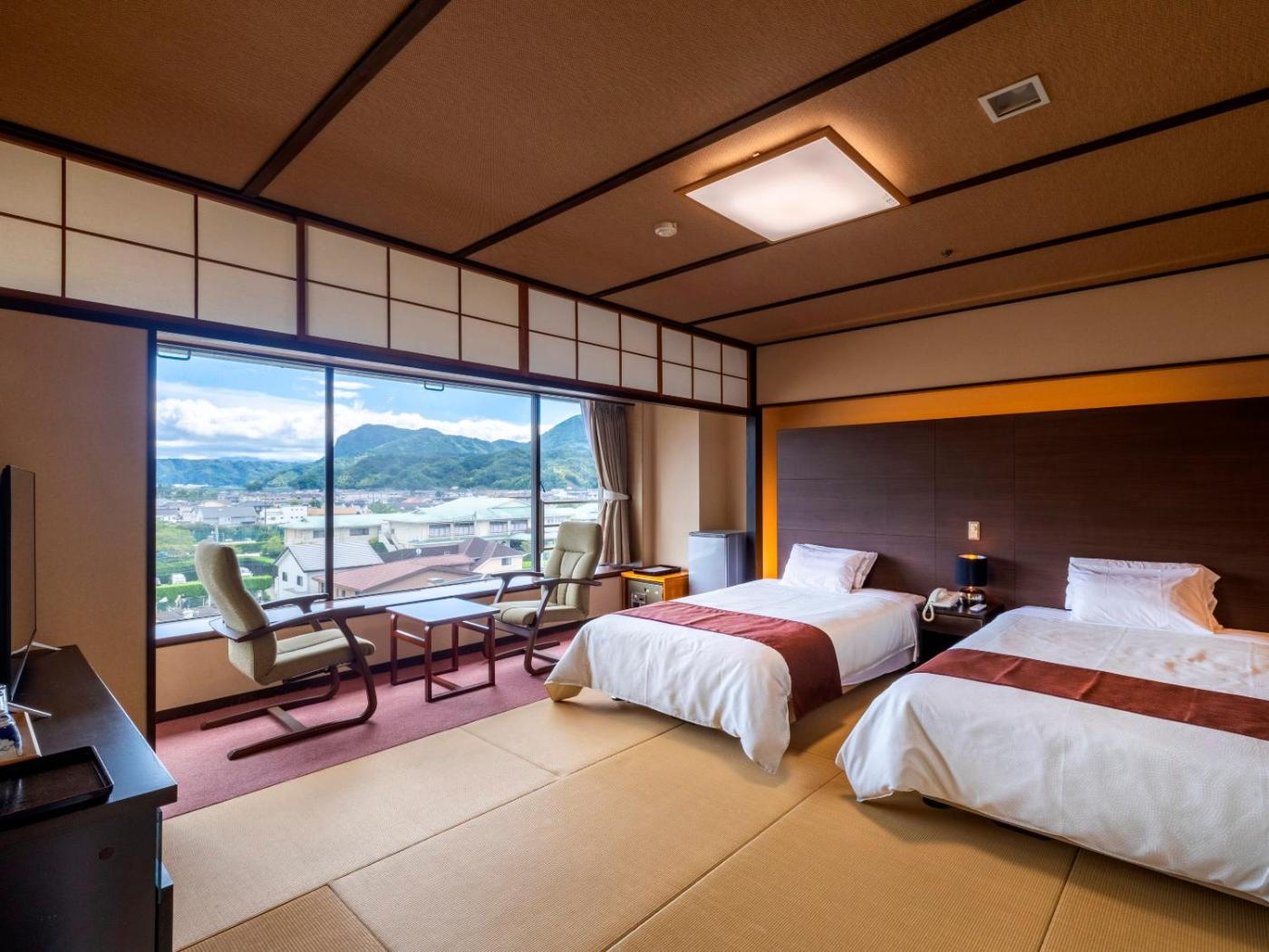 Standard Twin Room. The twin room provides air conditioning, tatami, a tea and coffee maker, a wardrobe and a flat-screen TV. The unit offers 2 beds. ;