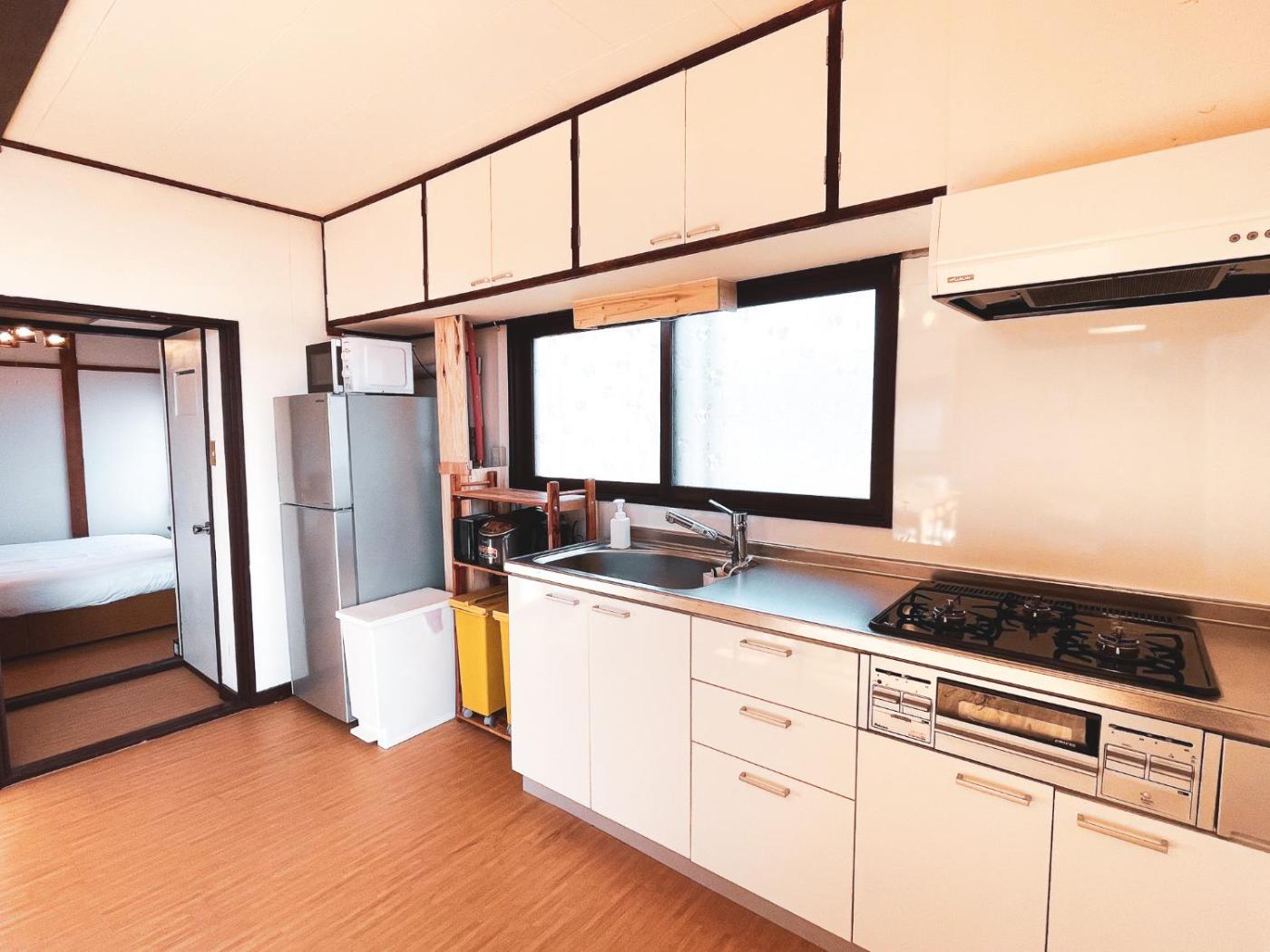 Three-Bedroom House. The air-conditioned holiday home features 3 bedrooms and 1 bathroom with a shower and a hairdryer. In the well-equipped kitchen, guests will find a stovetop, a refrigerator, kitchenware and a microwave. The holiday home has tatami floors, a seating area with a flat-screen TV, a washing machine, a dining area, as well as a sofa. The unit offers 2 beds and 4 futons.