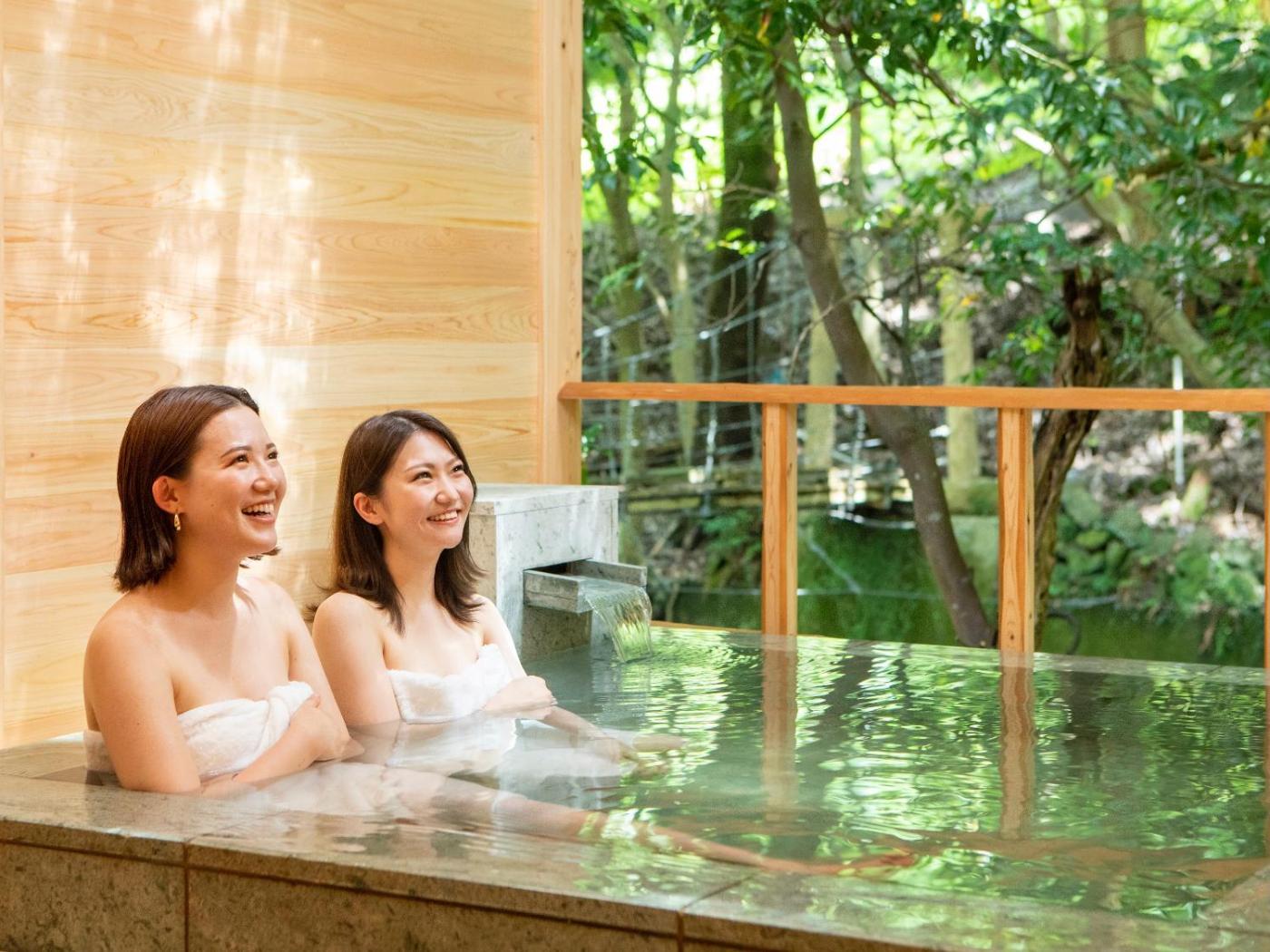 101 Japanese Style Suite 2 Rooms with Open Air Bath Onsen. The hot tub and private open-air bath are the standout features of this family room. The spacious family room offers air conditioning, tatami, a terrace with river views as well as a private bathroom featuring a bath. The unit offers 6 futons. ;