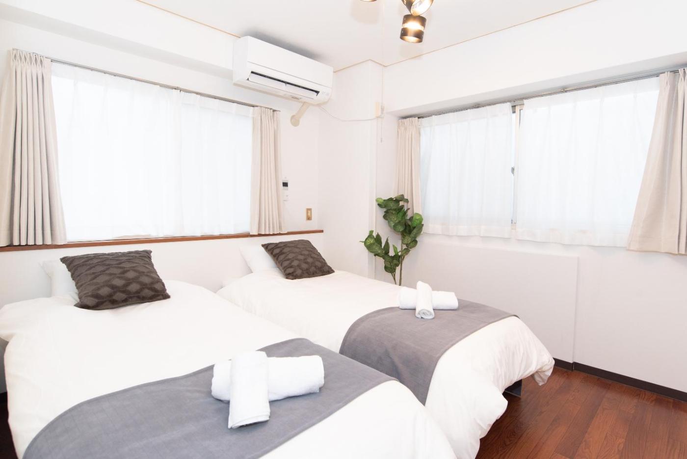 Two-Bedroom Apartment. The air-conditioned apartment has 2 bedrooms and 1 bathroom with a bath and a shower. A kitchenette fitted with a refrigerator, a microwave and an electric kettle is available for cooking and storing food. The apartment offers a washing machine. The unit has 2 beds and 3 futons. ;