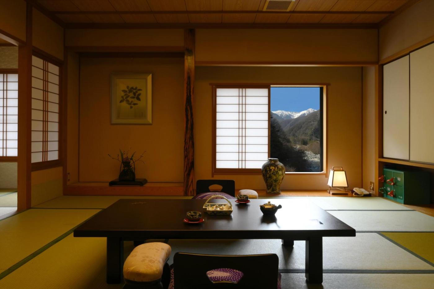 Superior Japanese-Style Room. The family room includes a private bathroom, well-fitted with a bath, a shower, a bidet, a hairdryer and slippers. The family rooms kitchenette, which has a refrigerator, is available for cooking and storing food. The air-conditioned family room features a flat-screen TV, tatami, a tea and coffee maker, a wardrobe as well as mountain views. The unit has 8 futons. ;