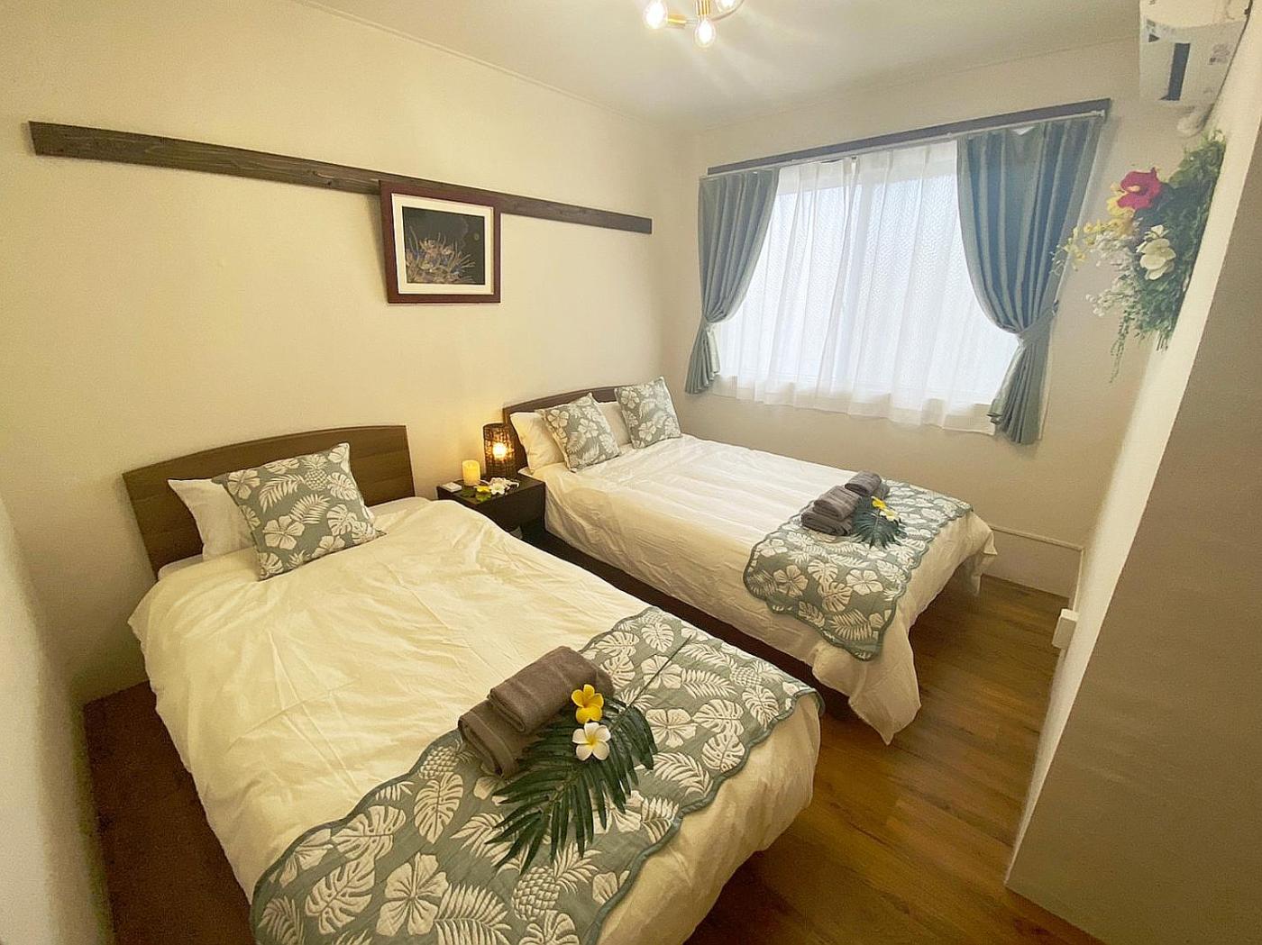 Three-Bedroom Villa. Featuring a private entrance, this air-conditioned villa comprises a kitchen, 3 bedrooms and 1 bathroom with a shower and a hairdryer. In the kitchen, guests will find a stovetop, a refrigerator, kitchenware and a microwave. The villa provides a washing machine, tatami, a dining area, a flat-screen TV, as well as a quiet street view. The unit offers 4 beds and 2 futons.