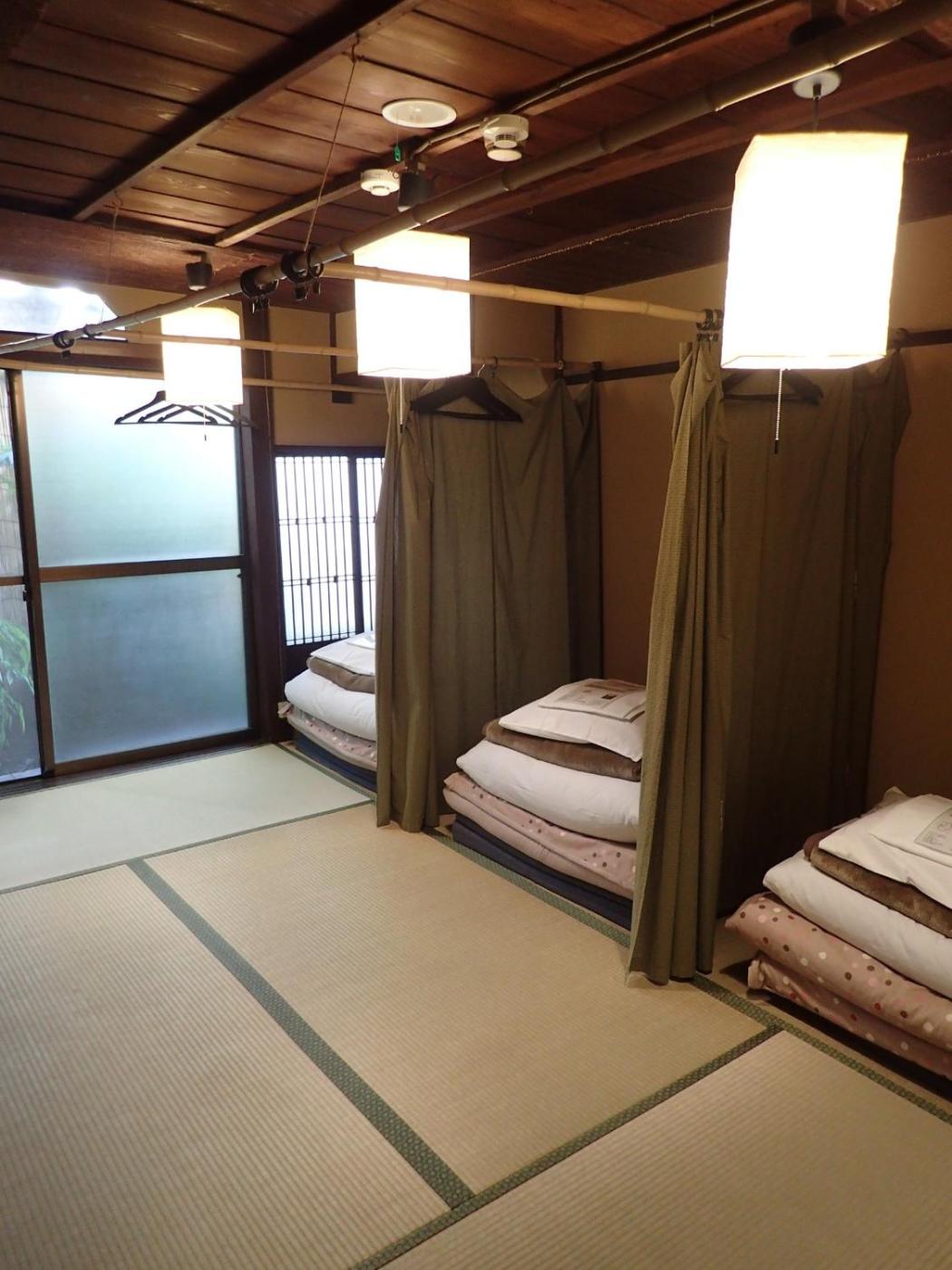 Female Dormitory Room. Price includes 1of Japanese-style futon bedding on a tatami (woven-straw) floor, in a room shared with multiple guests. All rooms are air-conditioned, have shared toilets and include simple Japanese furnishings and paper lamps. Showers are open 247 and towels must be rented. Free body soap and shampoo are provided. ;