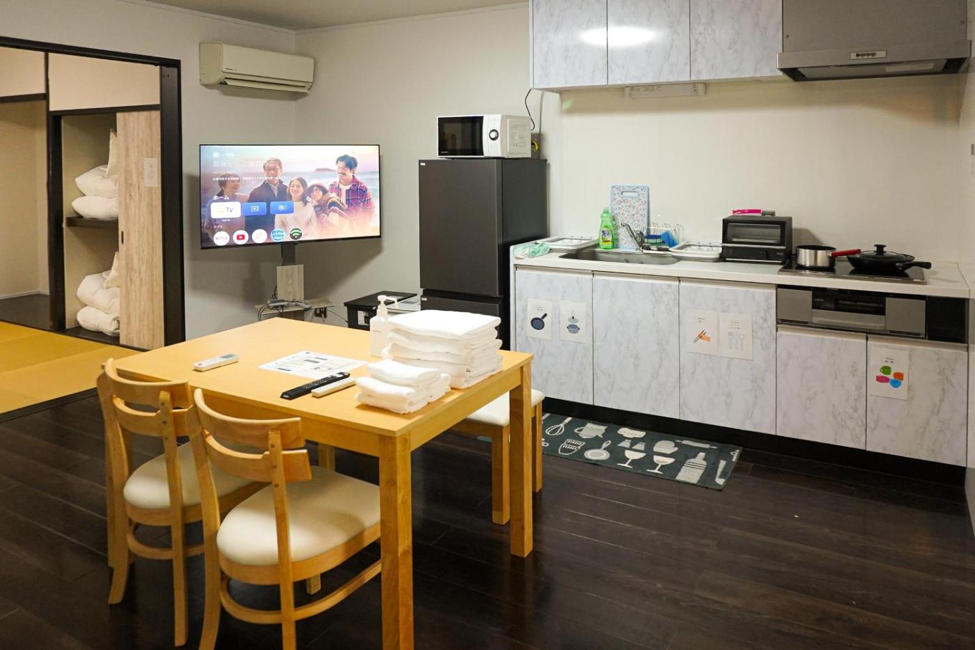 Two-Bedroom Apartment. This apartment features two spacious bedrooms with tatami (woven-straw) flooring and free WiFi access. Japanese futon bedding and bed linen are provided. Towels are available to each staying guest.