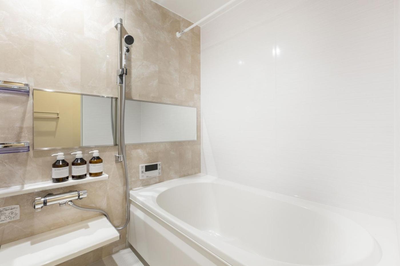 Deluxe Apartment. This apartments special feature is the hot tub. Featuring a private entrance, this air-conditioned apartment consists of 1 living room, 2 separate bedrooms and 1 bathroom with a walk-in shower and a bath. In the kitchen, guests will find a stovetop, a refrigerator, kitchenware and an oven. The apartment features tatami floors, a seating area with a flat-screen TV with satellite channels, soundproof walls, a tea and coffee maker, as well as a dining area. The unit offers 1 bed and 2 futons. ;