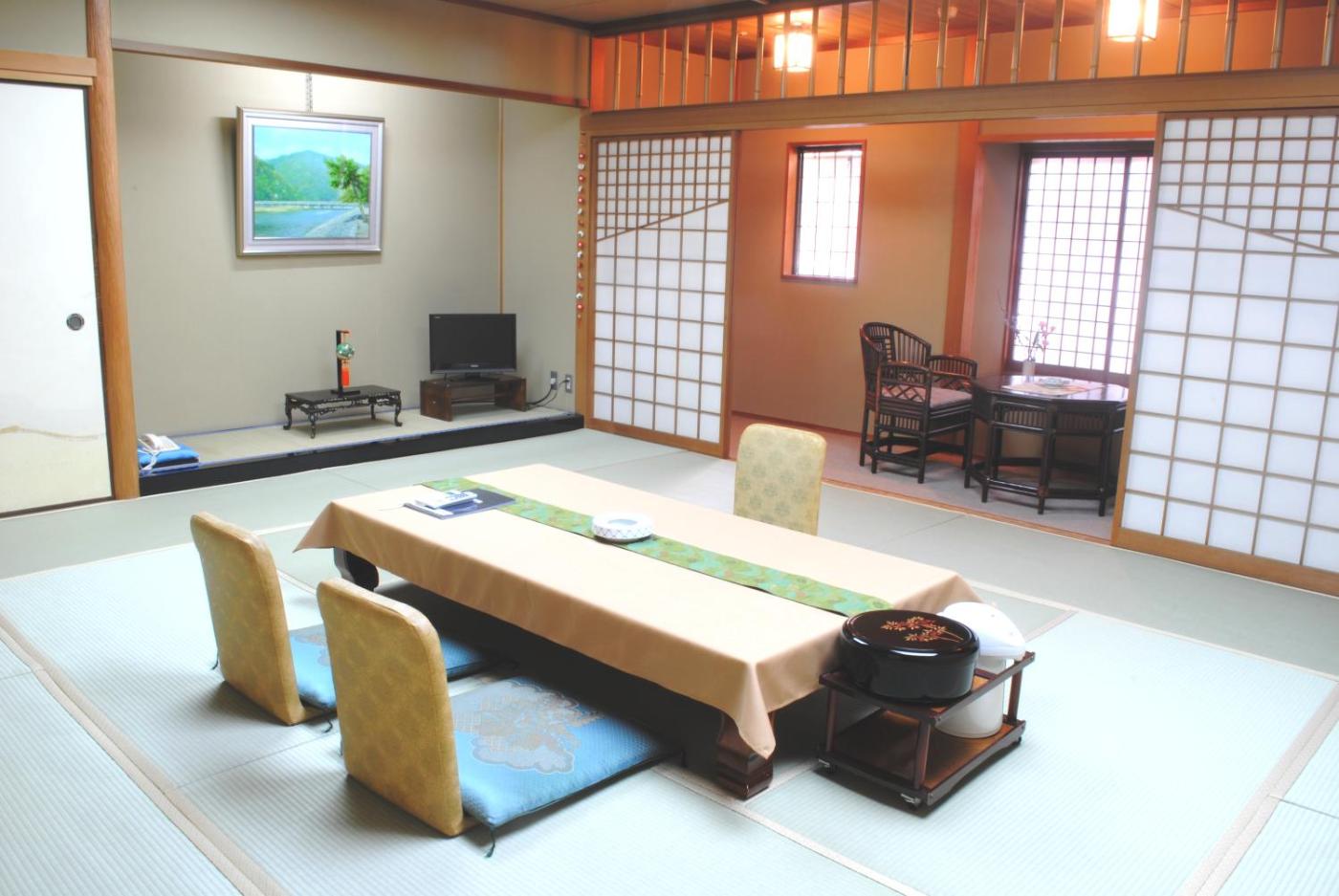 Japanese-Style Room. The rooms are located in the main building and feature tatami floors and futons. The Deluxe Suite has three separate rooms, one of which is a tea room. The tea room has a garden view. Japanese tea rooms are very small and suitable for only one person. There is a bath and toilet. ;