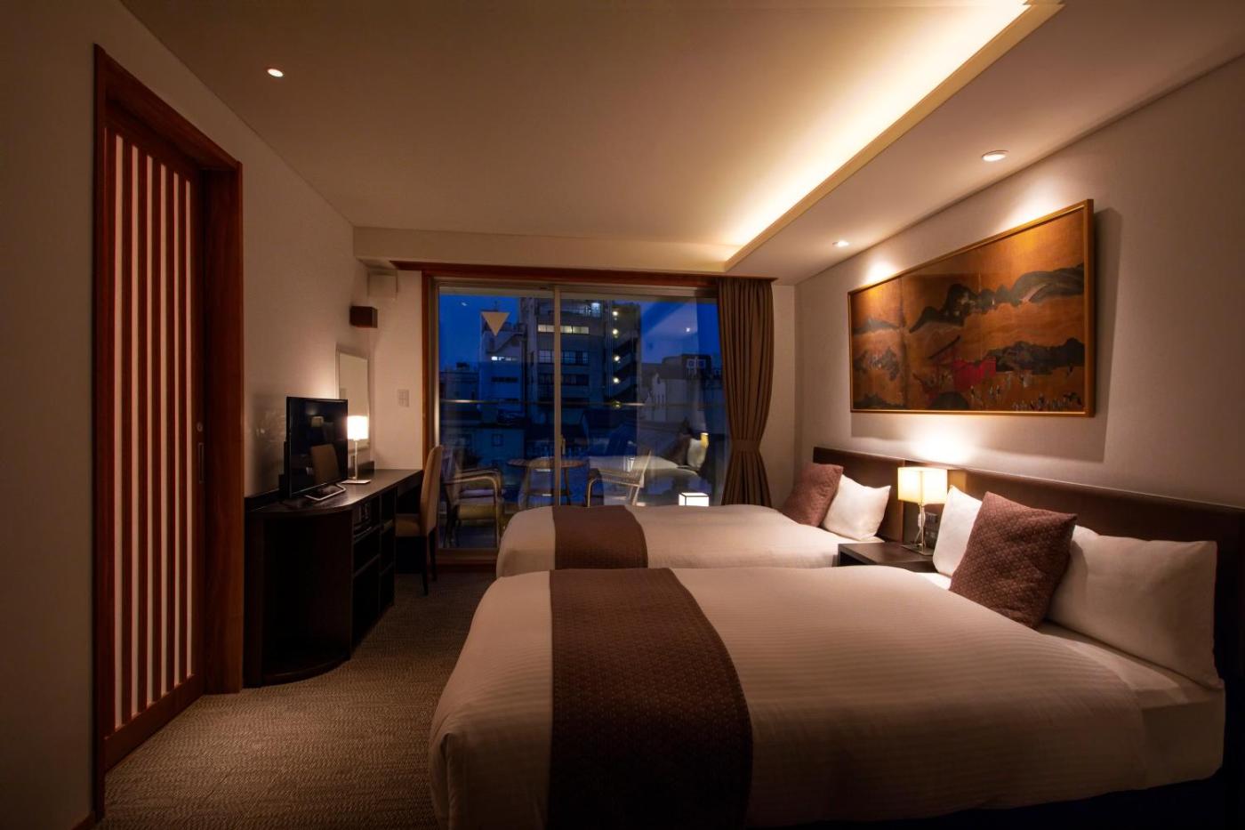 Standard Twin Room. This room features traditional Japanese-style decor such as a folding screen with gold leaf and ukiyo-e, or woodblock prints of traditionally Japanese motifs. Guests can enjoy the viewin Kyoto from the balcony of this room.The room is equipped with 2 Sealy beds (113 cm wide), TV and BOSE audio set. The kitchen has a microwave, refrigerator, coffee maker and basic kitchenware. This room has a private bathroom with a shower and a bath tub made from Chinese black pine wood. ;