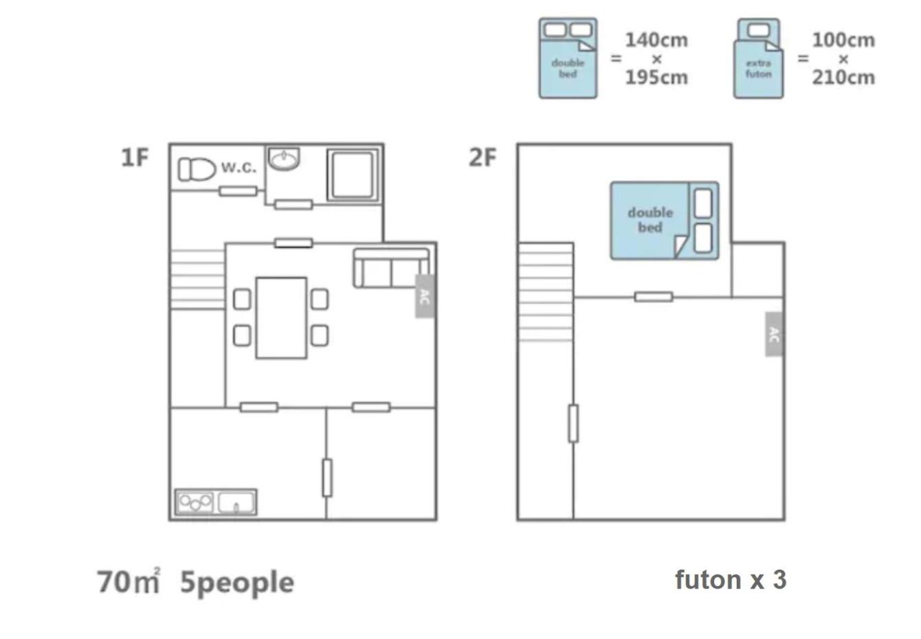 Two-Bedroom House. The air-conditioned holiday home has 2 bedrooms and 1 bathroom with a bath and a shower. In the well-fitted kitchen, guests will find a stovetop, a refrigerator, kitchenware and a microwave. The holiday home features a washing machine, tatami, a dining area, an electric kettle and a flat-screen TV. The unit has 1 bed and 4 futons.
