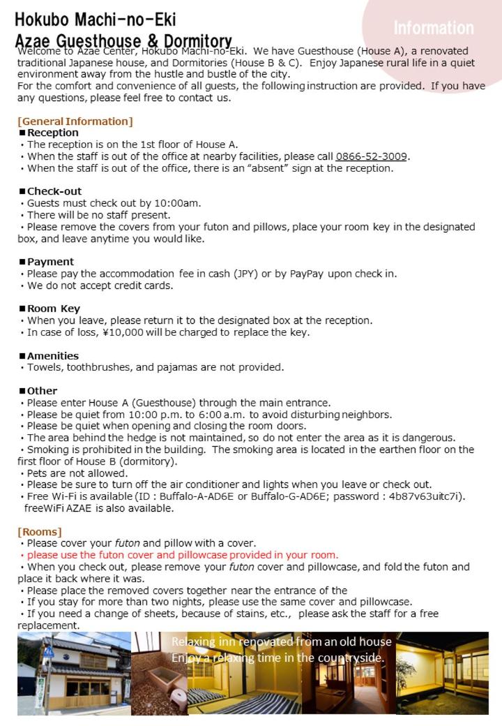 Set in Maniwa, within 22 km of Shoka Museum Ikegamitei and 23 km of Bukeyashiki Kyu Oriike Kyu Haibarake, 北房まちの駅 AZAE ドリトミー azae offers accommodation with a garden and free WiFi throughout the property as well as free private parking for guests who drive. The property is located 23 km from Takahashi Christian Church, 23 km from Raikyuji Temple and 23 km from Takahashi Folk Museum. The accommodation provides a shared kitchen, and organising tours for guests.