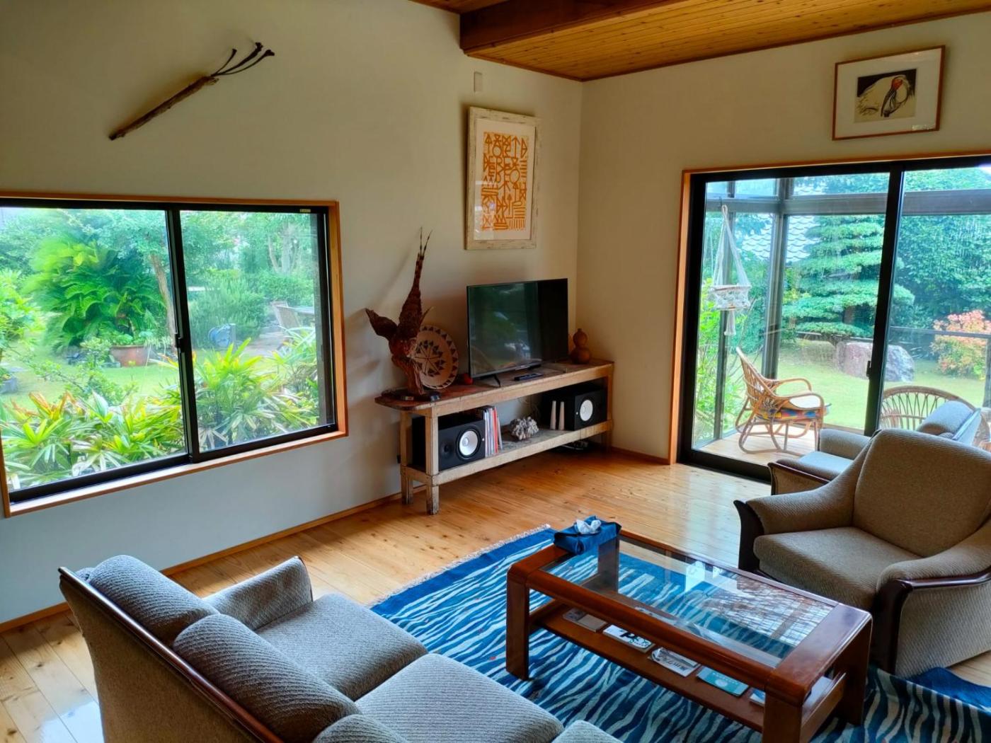 Three-Bedroom Villa. This villa includes 1 living room, 3 separate bedrooms and 1 bathroom with a bath and free toiletries. Guests will find a stovetop, a refrigerator, a dishwasher and kitchenware in the well-equipped kitchen. The villa also features a barbecue. The air-conditioned villa offers a flat-screen TV, a washing machine, tatami, a dining area as well as garden views. The unit has 4 beds and 6 futons.
