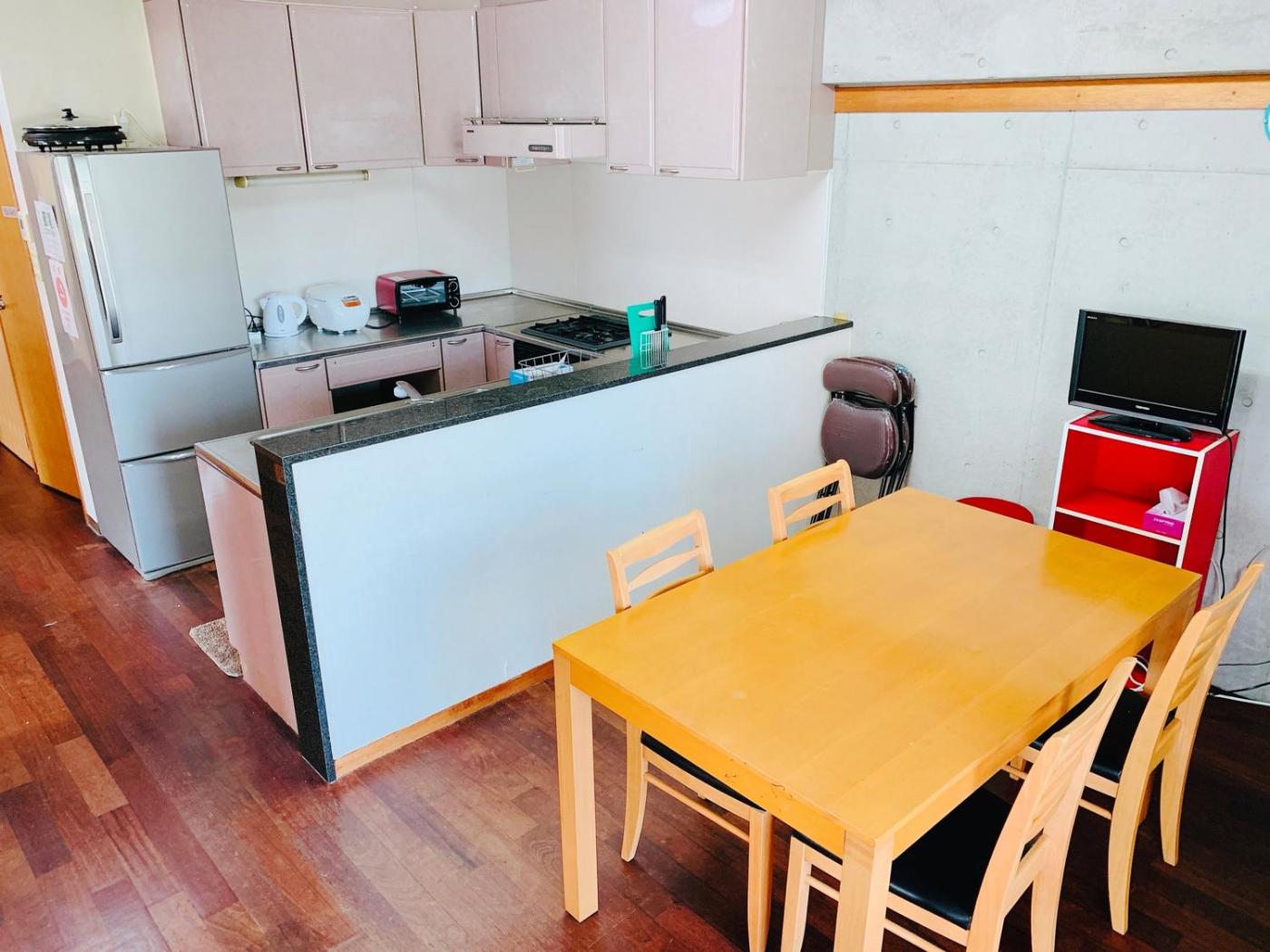 Three-Bedroom Apartment. This spacious apartment comes with 1 living room, 3 separate bedrooms and 1 bathroom with a shower and a hairdryer. Guests can make meals in the kitchen that features a stovetop, a refrigerator, kitchenware and a microwave. The air-conditioned apartment features a flat-screen TV, a washing machine, tatami and a dining area. The unit has 2 beds and 7 futons. ;