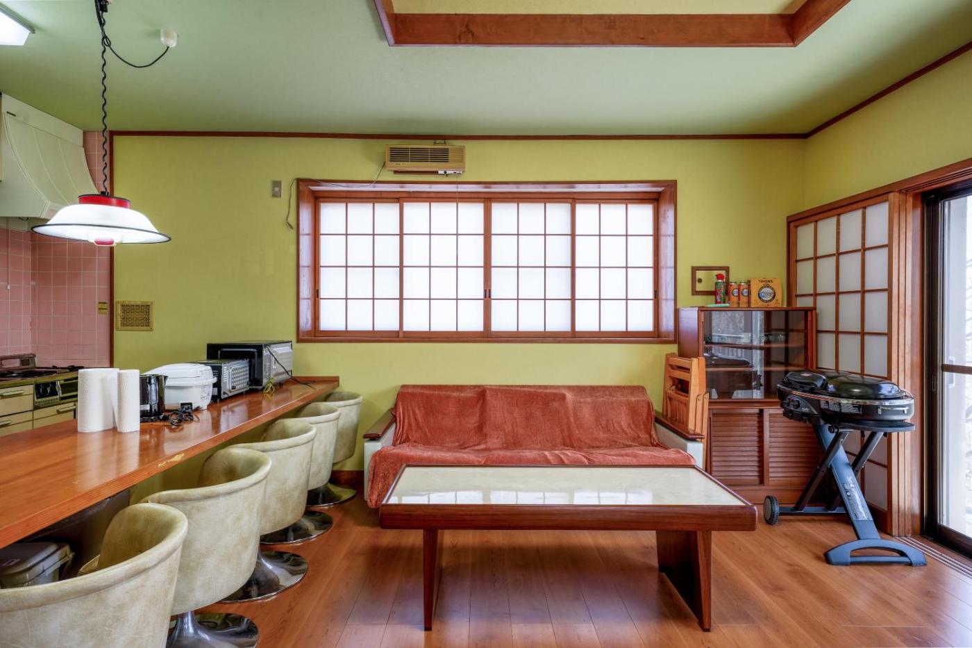 Four-Bedroom House. Guests will find a stovetop, a refrigerator, kitchenware and an oven in the kitchen. The holiday home also features a barbecue. The holiday home has tatami floors, a seating area with a flat-screen TV, air conditioning, a washing machine as well as garden views. The unit has 3 futons.