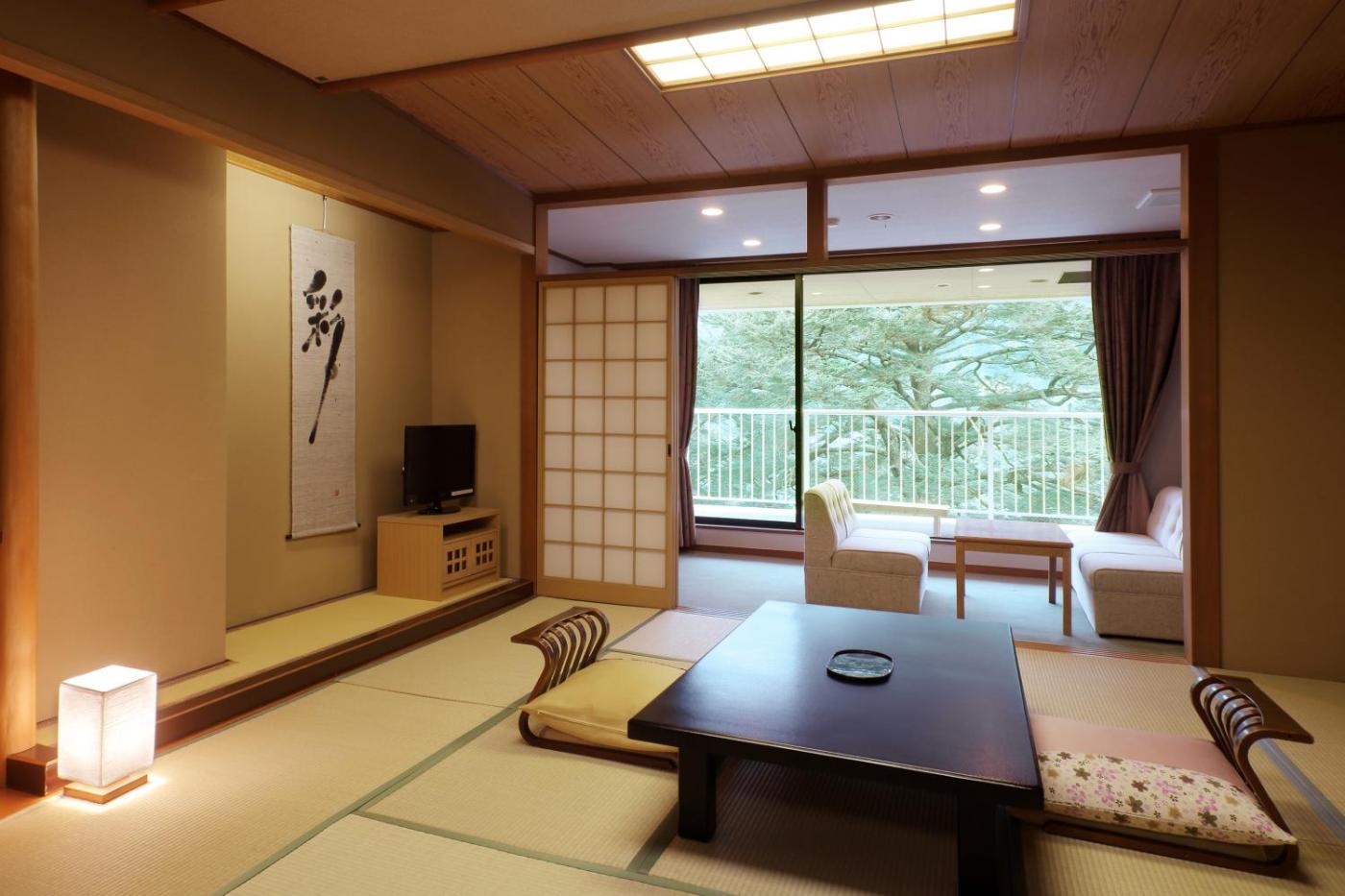 Suite with Mountain View. The private open-air bath is the standout feature of this suite. This air-conditioned suite features 1 living room, 1 separate bedroom and 1 bathroom with a bath. Boasting a balcony with mountain views, this suite also features tatami and a flat-screen TV. The unit has 1 bed. ;