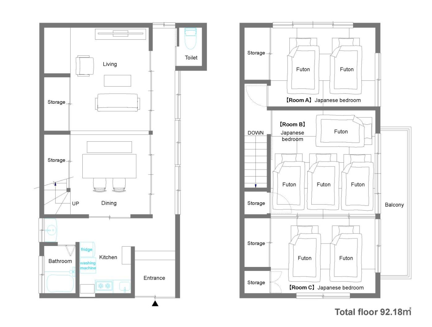 Japanese-Style Room. The spacious family room offers air conditioning, a washing machine, as well as a private bathroom featuring a bath and a shower. In the kitchen, guests will find a stovetop, a refrigerator, kitchenware and a microwave. The family room features tatami floors, a seating area with a flat-screen TV, a private entrance, a dining area, as well as a wardrobe. The unit offers 8 futons.
