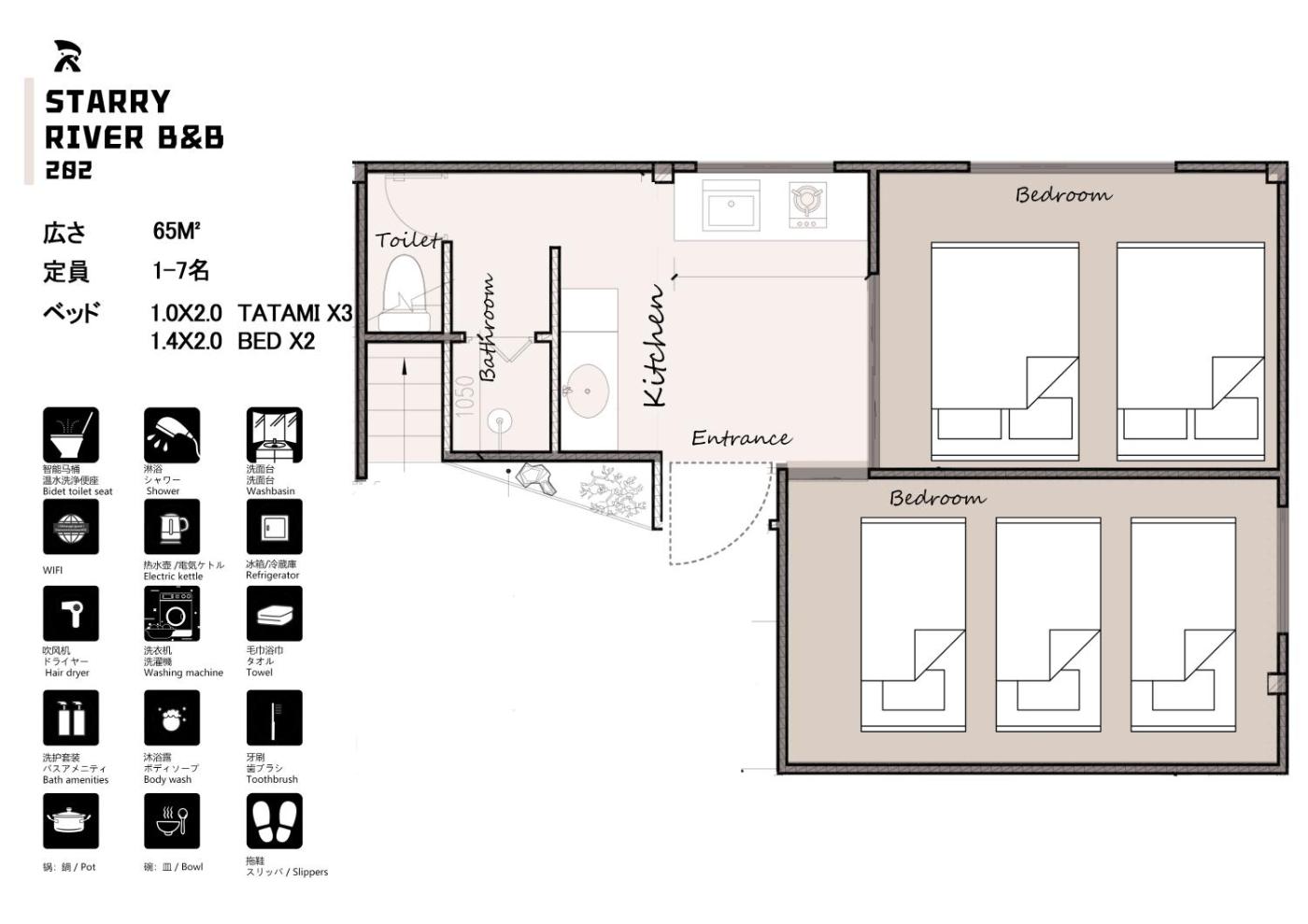 Two-Bedroom Apartment. The air-conditioned apartment has 2 bedrooms and 1 bathroom with a shower and a bidet. The well-equipped kitchen features a refrigerator, kitchenware, a microwave and a tea and coffee maker. The apartment features a washing machine, tatami, a dining area as well as a wardrobe. The unit has 5 futons.