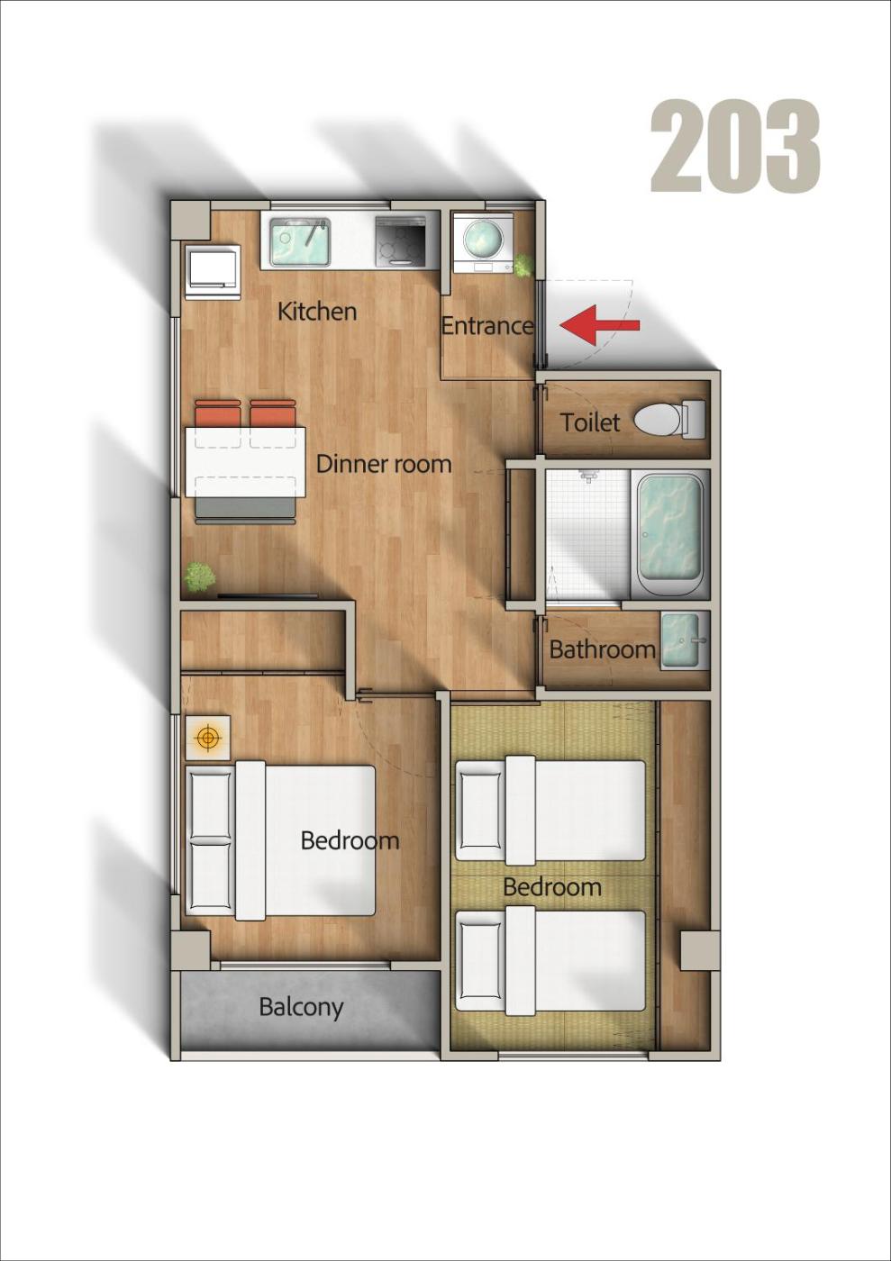 Two-Bedroom Apartment. This apartment features a hot tub. This apartment comprises 1 living room, 2 separate bedrooms and 1 bathroom with a walk-in shower and free toiletries. Meals can be prepared in the well-fitted kitchen, which comes with a stovetop, a refrigerator, kitchenware and a microwave. The air-conditioned apartment provides a flat-screen TV, a washing machine, tatami, a wardrobe as well as city views. The unit offers 4 beds.