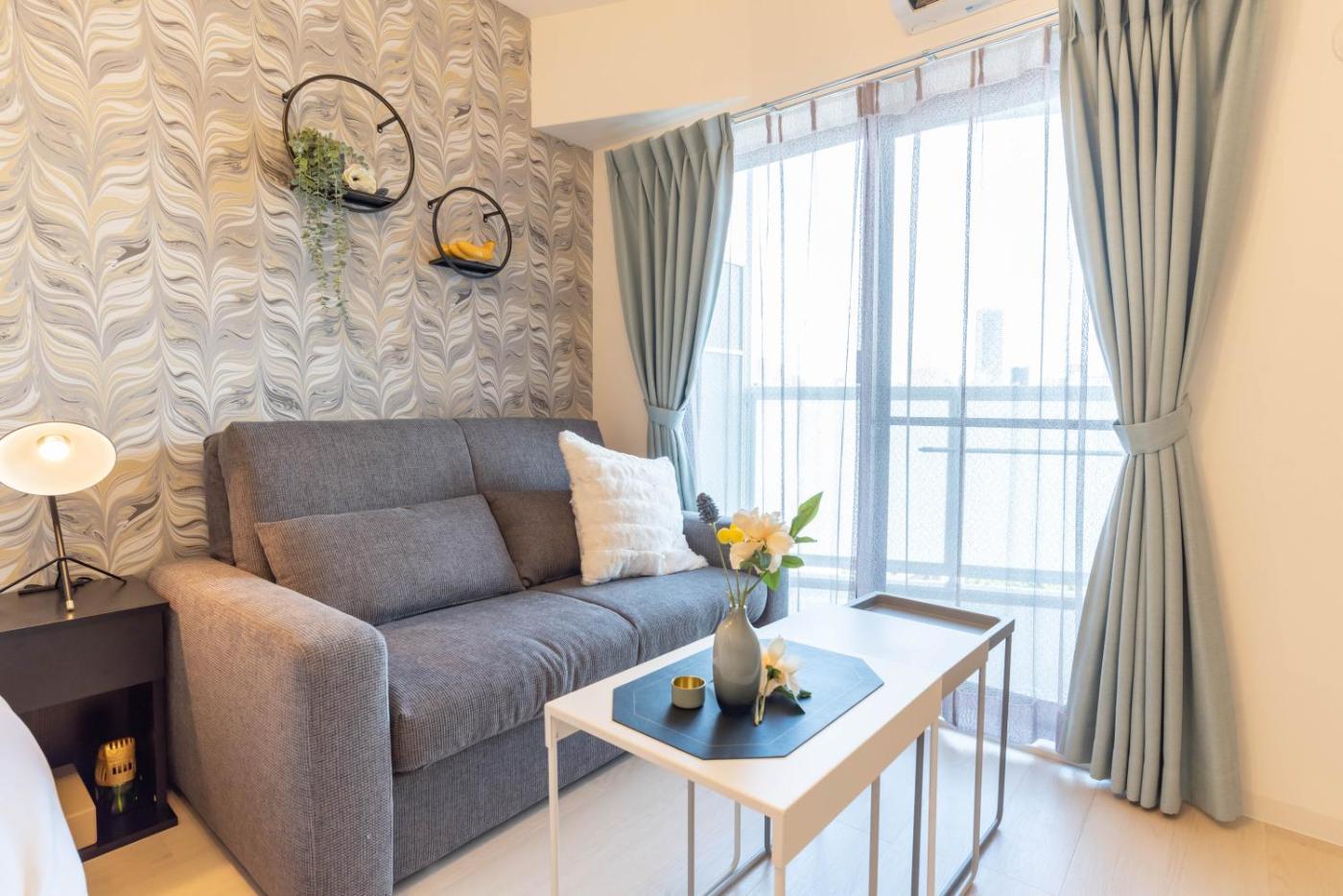 One-Bedroom Apartment. Featuring a private entrance, this air-conditioned apartment consists of 1 living room, 1 separate bedroom and 1 bathroom with a bath and a shower. Guests can make meals in the kitchen that is equipped with a stovetop, a refrigerator, kitchenware and a microwave. Boasting a balcony with a quiet street view, this apartment also provides a washing machine and a flat-screen TV. The unit offers 2 beds.