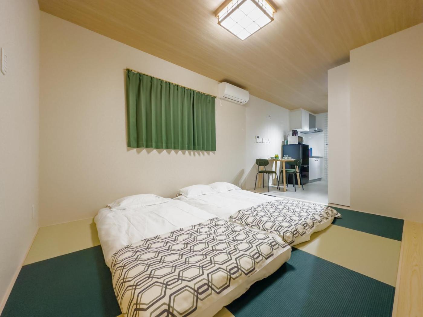 One-Bedroom Villa. This villa provides a hot tub. This villa comprises 1 living room, 1 separate bedroom and 1 bathroom with a bath and free toiletries. The villas kitchen, which has a refrigerator and a microwave, is available for cooking and storing food. This villa is air-conditioned and features a seating area with a flat-screen TV, a washing machine, tatami, an electric kettle, as well as tumble dryer. The unit offers 2 futons. ;