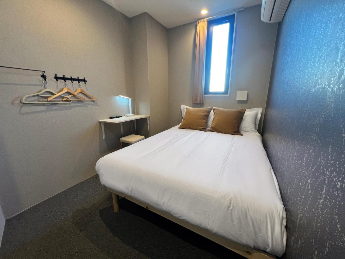 Twin Room with Shared Bathroom. The twin room provides air conditioning, tatami, as well as a shared bathroom featuring a shower and a hairdryer. Rooms on the upper floors are reachable by lift. The unit offers 2 futons. ;