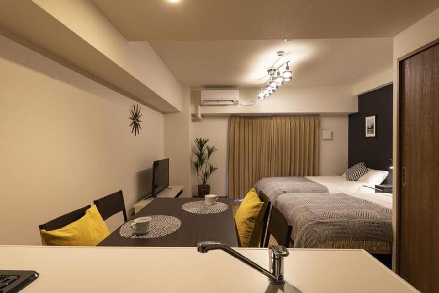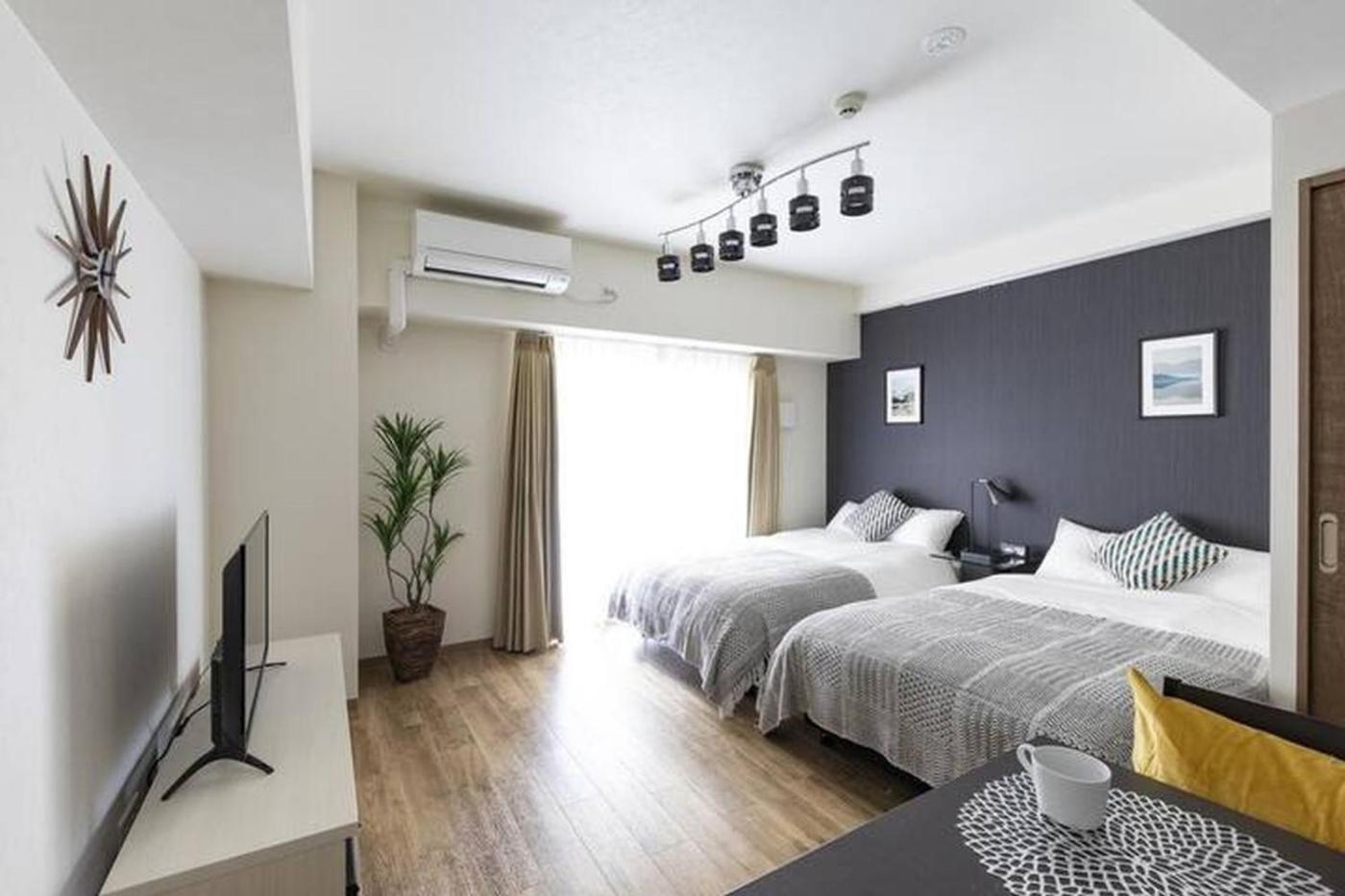 Two-Bedroom Apartment. The air-conditioned apartment features 2 bedrooms and 1 bathroom with a bath and a shower. Guests can make meals in the kitchen that is equipped with a stovetop, a refrigerator, kitchenware and a microwave. Featuring a balcony, this apartment also provides a washing machine, a dining area and a flat-screen TV. The unit offers 4 beds.
