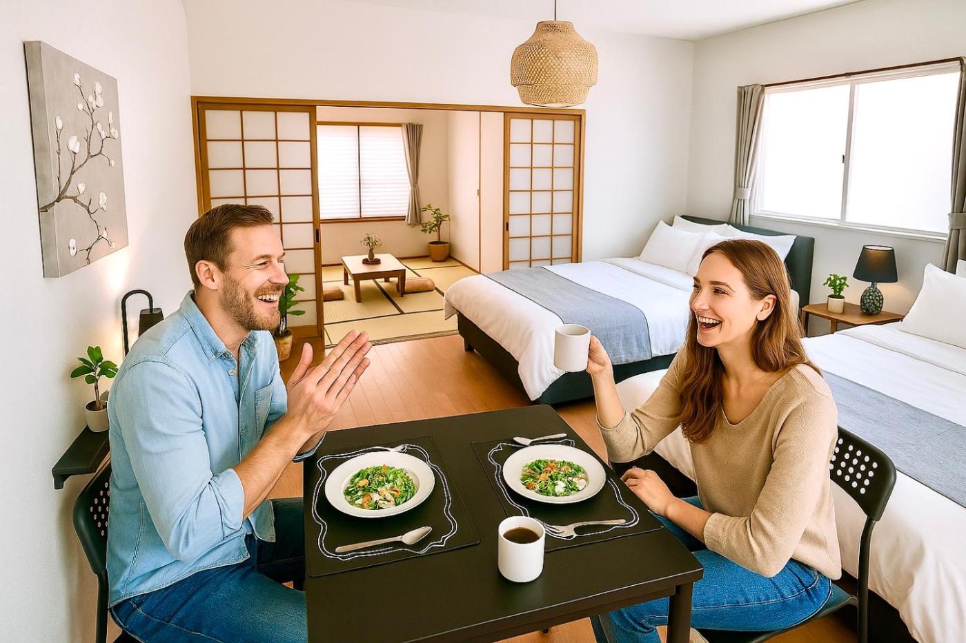 Two-Bedroom Apartment. Featuring a private entrance, this air-conditioned apartment consists of a kitchen, 1 bedroom and 1 bathroom with a bath and a shower. The fully equipped kitchen has a stovetop, a refrigerator, kitchenware and a microwave. This apartment features a washing machine, tatami, a flat-screen TV with streaming services and a balcony. The unit offers 4 beds.