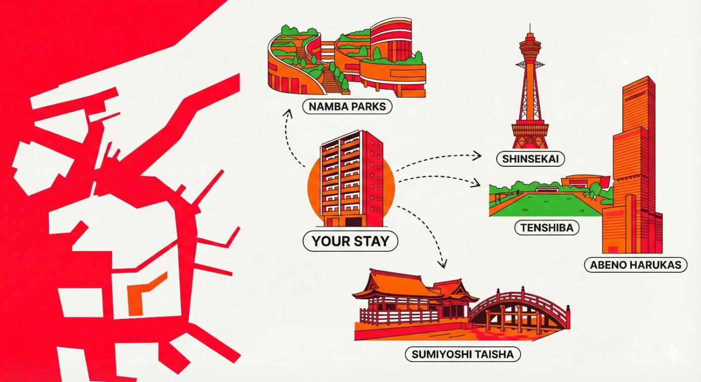In the Nishinari Ward district of Osaka, close to Matsunomiya Shrine, Roof Hanazonocho-Nishi has free WiFi and a washing machine. There is a private entrance at the apartment for the convenience of those who stay. The rooms have a balcony with city views.