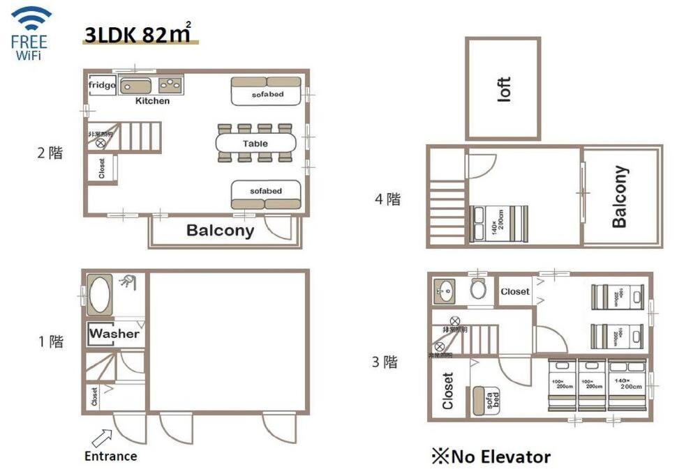 Three-Bedroom Apartment. Featuring a private entrance, this air-conditioned apartment comprises 1 living room, 3 separate bedrooms and 1 bathroom with a bath and a shower. In the well-fitted kitchen, guests will find a stovetop, a refrigerator, kitchenware and a microwave. The spacious apartment provides a washing machine, tatami, a tea and coffee maker, a flat-screen TV with streaming services, as well as city views. The unit offers 9 beds and 1 futon.