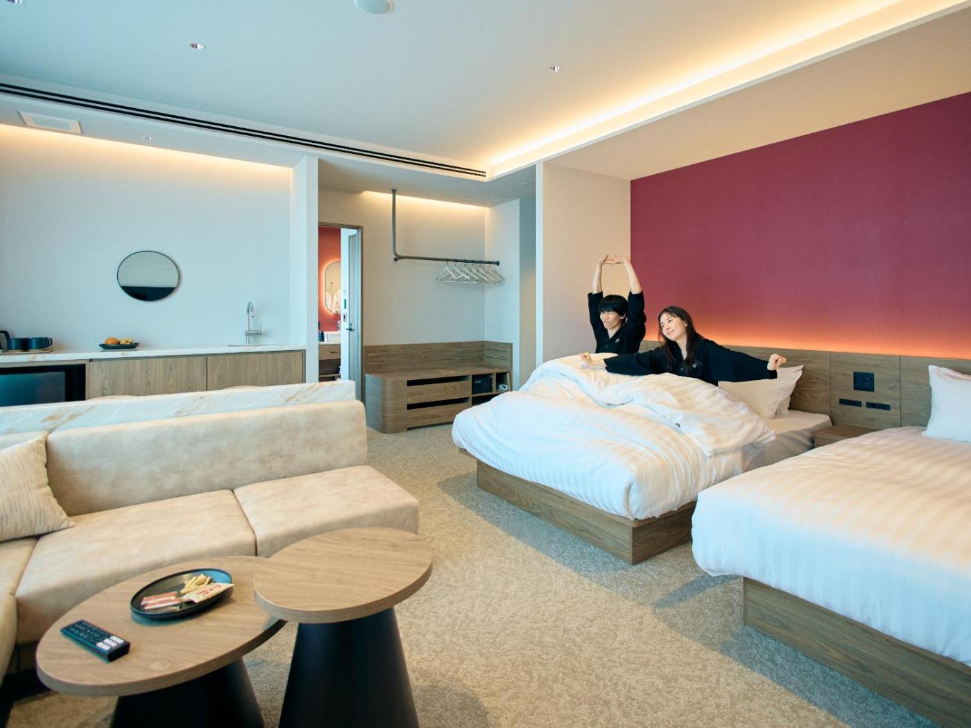 Japanese Modern Room. The family room includes a private bathroom, well-fitted with a bath, a shower, a bidet, a hairdryer and slippers. The fully equipped kitchenette features a refrigerator, kitchenware and a microwave. This family room is air-conditioned and has a flat-screen TV, tatami, a safe deposit box and an electric kettle. The unit has 2 beds and 2 futons. ;