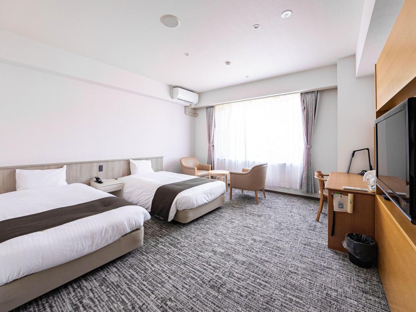 Standard Twin Room. The twin room includes a private bathroom, well-fitted with a bath, a shower, a bidet, a hairdryer and slippers. This twin room is air-conditioned and has a flat-screen TV, a tea and coffee maker, yukata and heating. The unit has 2 beds. ;