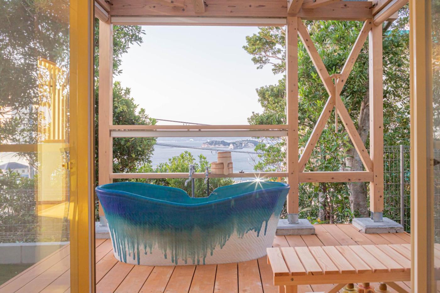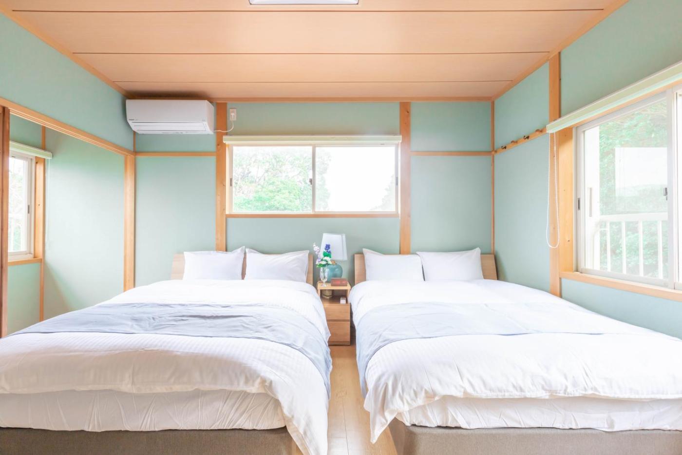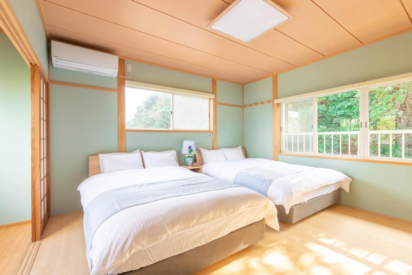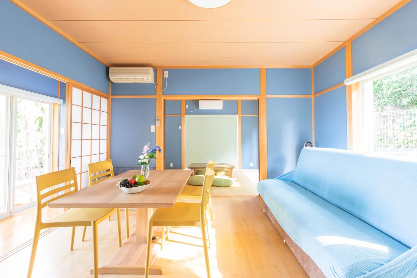 Two-Bedroom House. Guests will have a special experience as this holiday home features a hot tub and a private open-air bath. Featuring a private entrance, this air-conditioned holiday home comprises 1 living room, 2 separate bedrooms and 1 bathroom with a bath and a shower. Guests will find a stovetop, a refrigerator, kitchenware and a microwave in the well-equipped kitchen. The holiday home also provides guests with a barbecue. The holiday home provides a flat-screen TV, a washing machine, tatami, a dining area as well as sea views. The unit offers 3 beds and 4 futons.