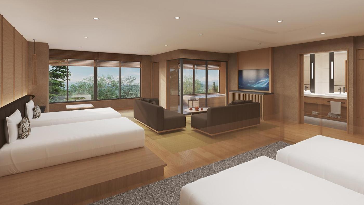 Premium Suite with Open-Air Bath (River Side). This spacious suite is comprised of 1 living room, 1 separate bedroom and 1 bathroom with a bath and free toiletries. The suite offers air conditioning, a tea and coffee maker, yukata, heating, as well as a TV. The unit offers 2 beds and 3 futons.