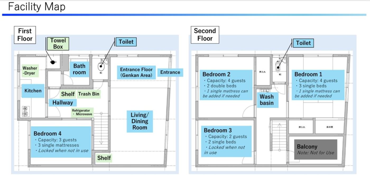 Four-Bedroom Apartment. Boasting a private entrance, this spacious apartment also features 4 bedrooms, a seating area and 1 bathroom with a bath and a shower. The well-equipped kitchen has a stovetop, a refrigerator, kitchenware and a microwave. The air-conditioned apartment features a washing machine, tatami and a dining area. The unit has 7 beds and 5 futons.
