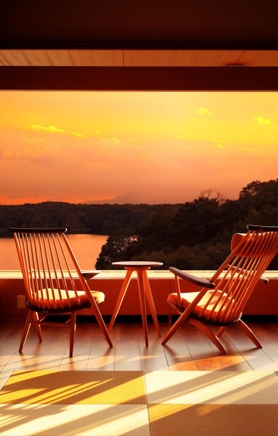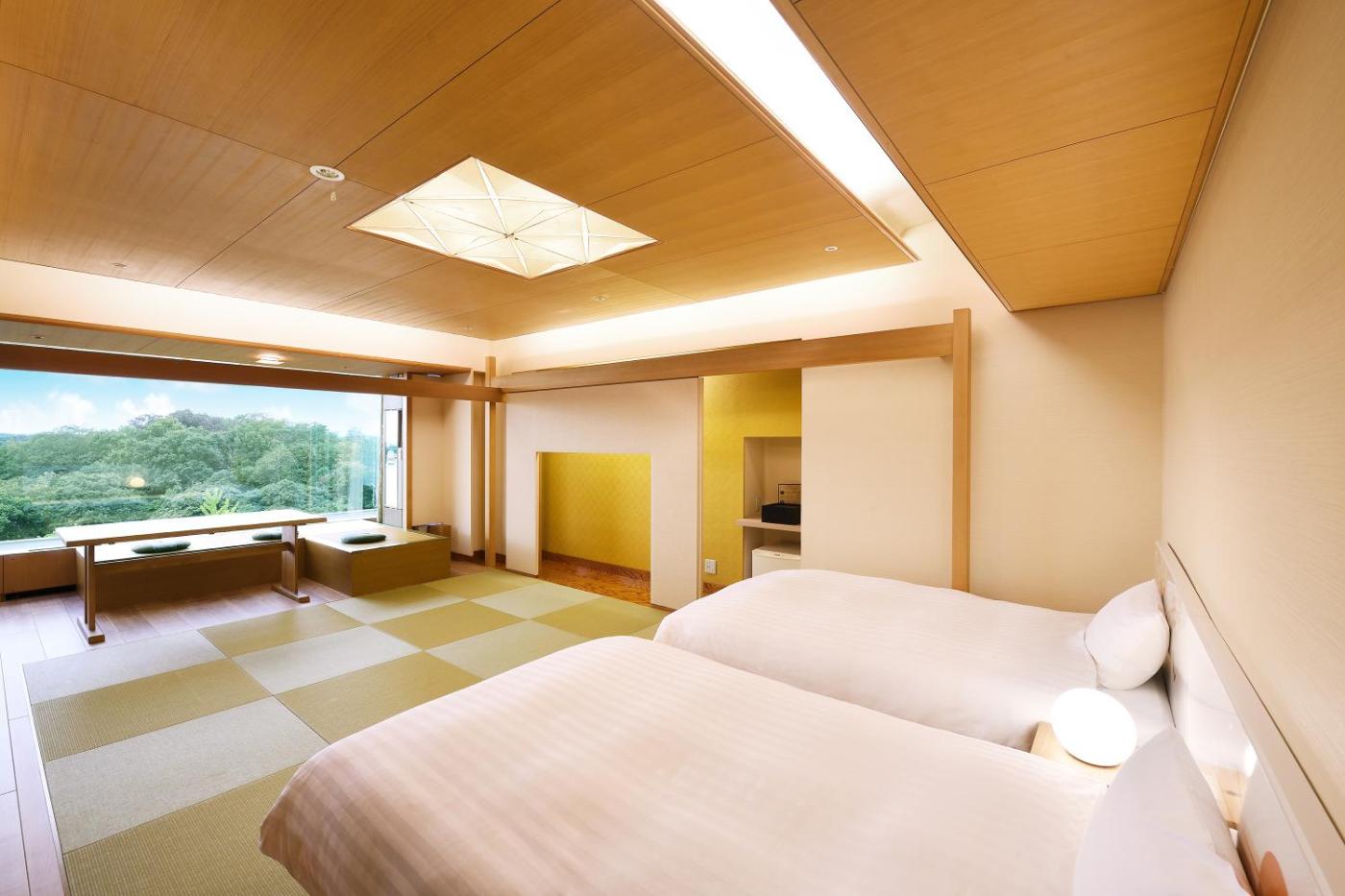 Deluxe Twin Room. The twin room includes a private bathroom, well-fitted with a bath, a shower, a bidet, a hairdryer and slippers. The spacious air-conditioned twin room features a flat-screen TV with satellite channels, tatami, a tea and coffee maker, a safe deposit box as well as lake views. The unit has 2 beds and 4 futons. ;