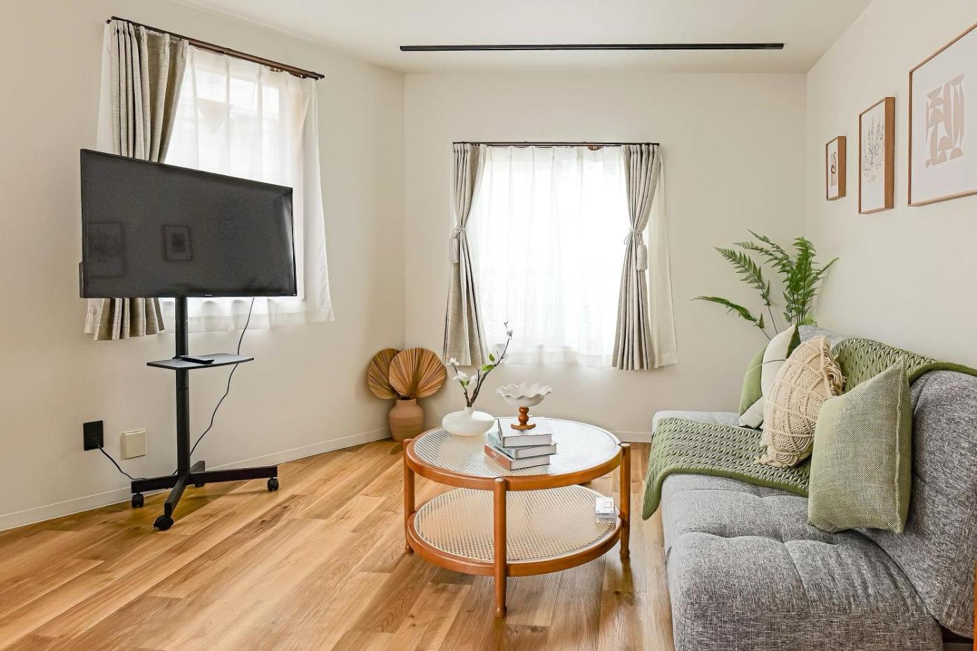 Two-Bedroom Apartment. Boasting a private entrance, this air-conditioned apartment includes 1 living room, 2 separate bedrooms and 1 bathroom with a bath and a shower. Guests can make meals in the kitchen that is fitted with a stovetop, a refrigerator, kitchenware and a microwave. The apartment offers a TV, a washing machine, tatami, a dining area as well as a quiet street view. The unit has 5 beds.