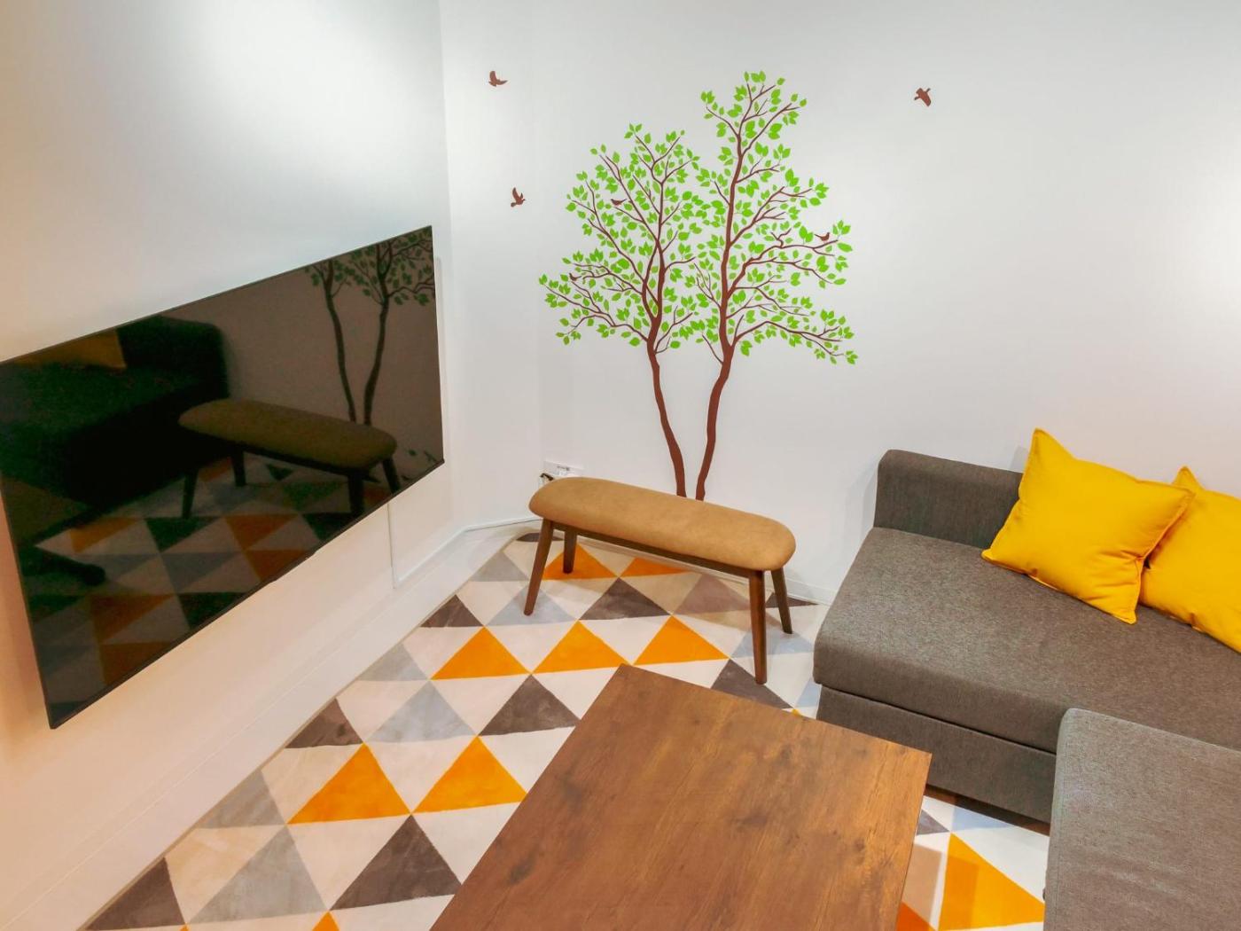 Apartment. Featuring a private entrance, this air-conditioned apartment consists of 1 living room, 1 separate bedroom and 1 bathroom with a bath and a hairdryer. Guests can make meals in the fully equipped kitchen that features a refrigerator, kitchenware and a microwave. The apartment provides a washing machine, an electric kettle, heating, a TV with cable channels, as well as city views. The unit offers 2 beds and 1 futon.