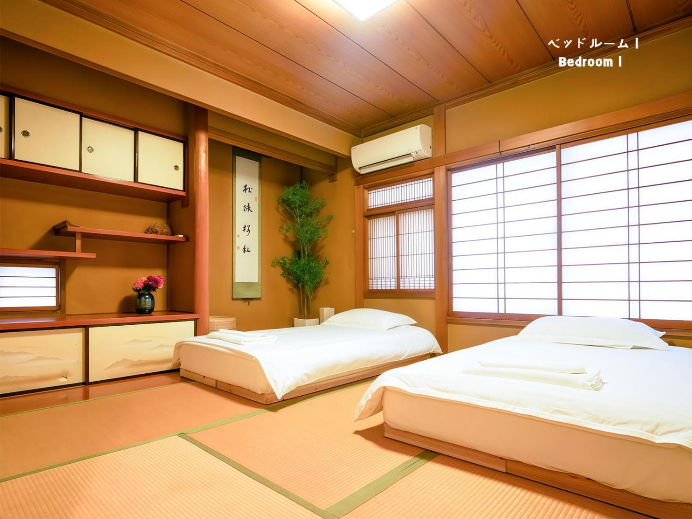 Two-Bedroom Villa. This villas standout feature is the hot tub. Featuring a private entrance, this air-conditioned villa is comprised of 1 living room, 2 separate bedrooms and 1 bathroom with a walk-in shower and a bath. Guests can make meals in the kitchen that is fitted with a stovetop, a refrigerator, kitchenware and a microwave. Boasting a terrace with garden views, this villa also offers tatami and a flat-screen TV. The unit offers 10 beds and 1 futon. ;