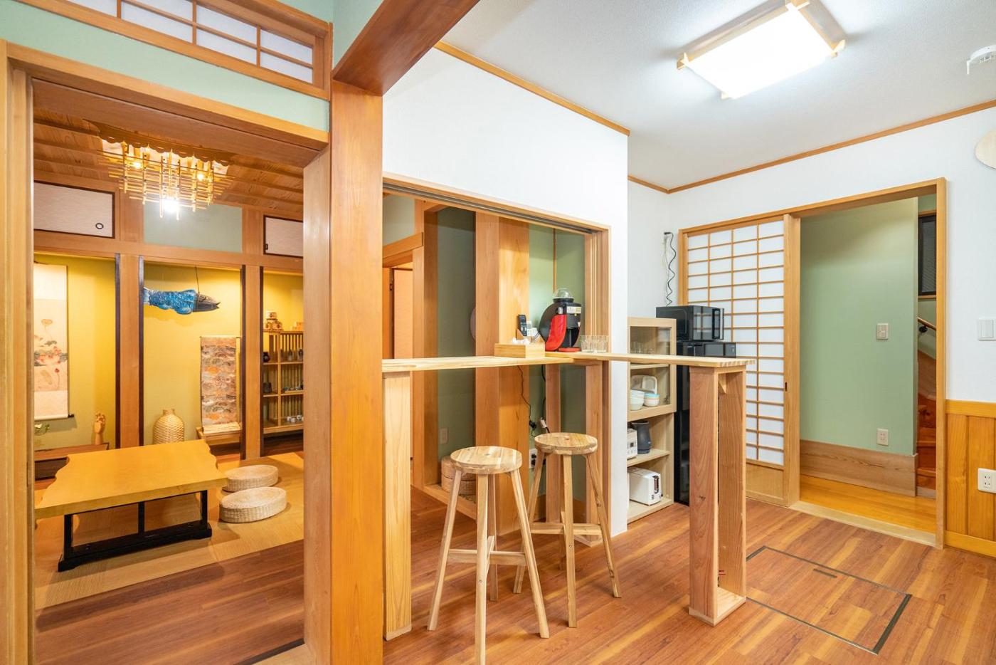 The air-conditioned ryokan consists of 2 bedrooms, a living room, a fully equipped kitchen with a microwave and a coffee machine, and 1 bathroom with a hot tub and slippers. Towels and bed linen are featured in the ryokan. For added privacy, the accommodation features a private entrance.
