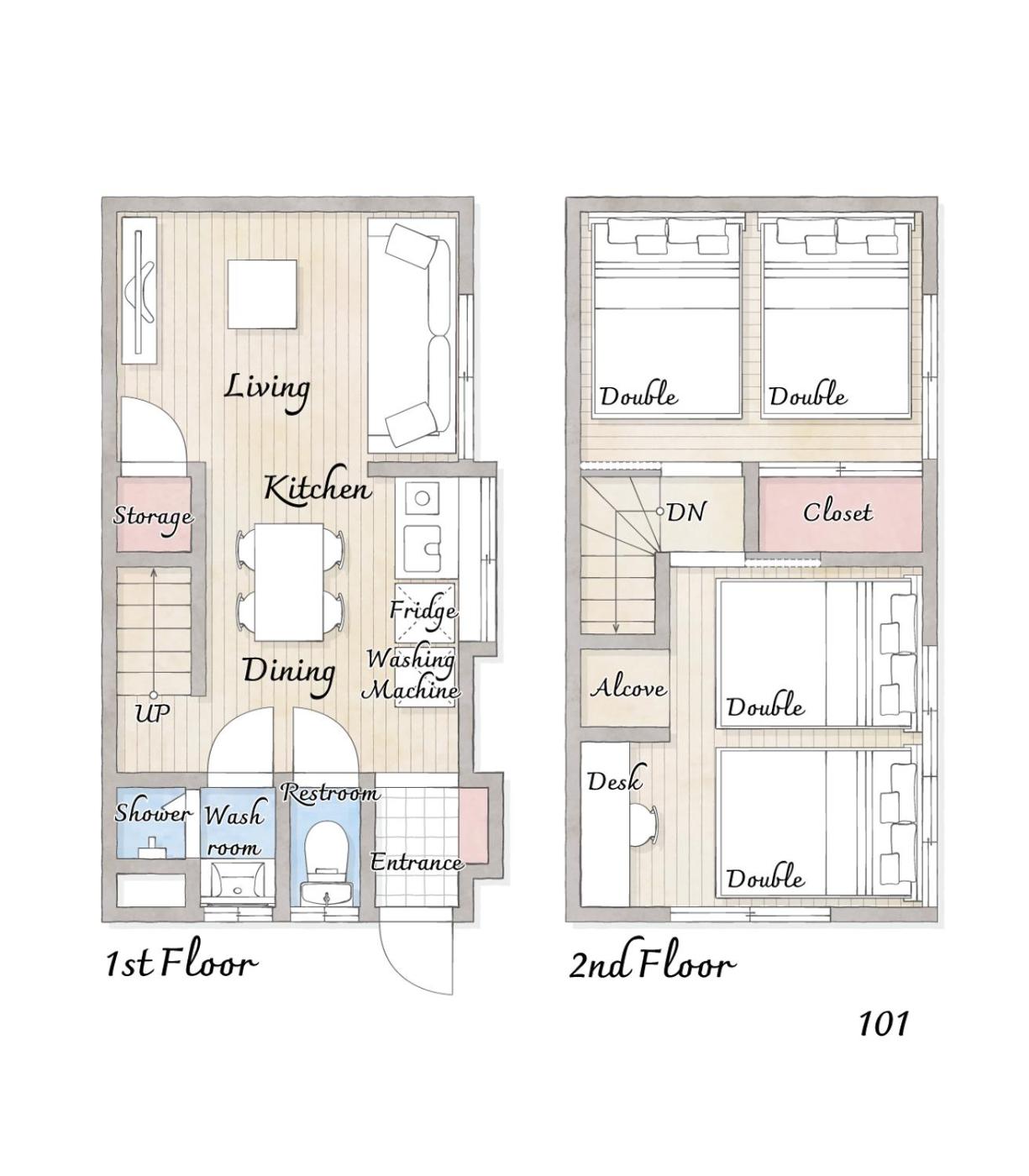Three-Bedroom Villa. Featuring a private entrance, this air-conditioned villa consists of 1 living room, 2 separate bedrooms and 1 bathroom with a shower and a bidet. In the kitchen, guests will find a stovetop, a refrigerator, kitchenware and a microwave. The villa provides a flat-screen TV with streaming services, a washing machine, tatami, a dining area as well as city views. The unit offers 5 beds.