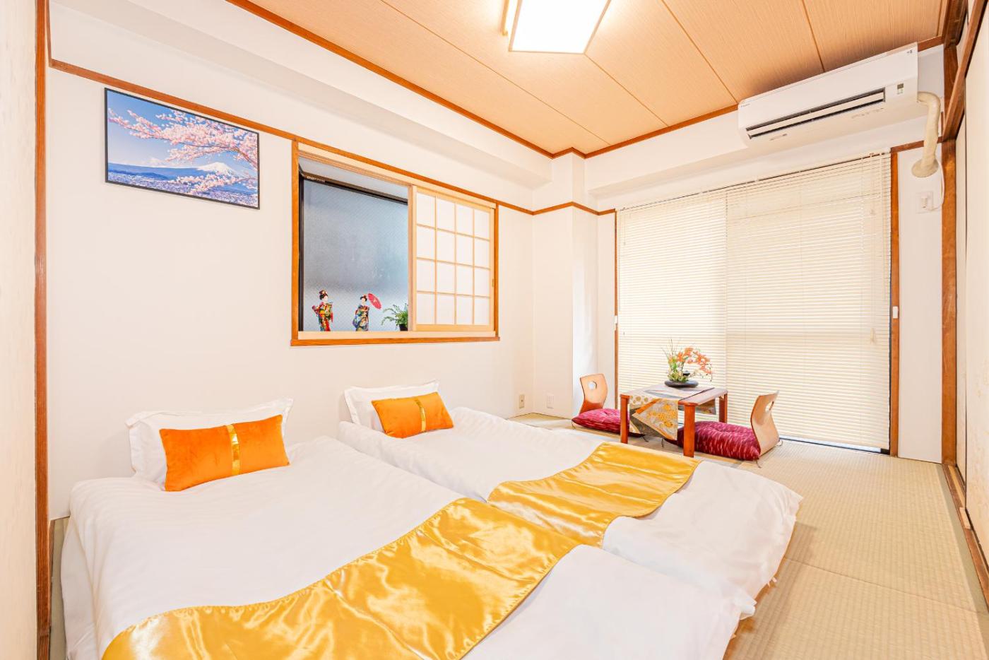 Family Suite. Boasting a private entrance, this spacious suite also comes with 2 bedrooms, a seating area and 1 bathroom with a bath and a shower. Guests can make meals in the kitchen that features a stovetop, a refrigerator, kitchenware and a microwave. The air-conditioned suite features a flat-screen TV, a washing machine, tatami, soundproof walls as well as city views. The unit has 2 beds and 3 futons.