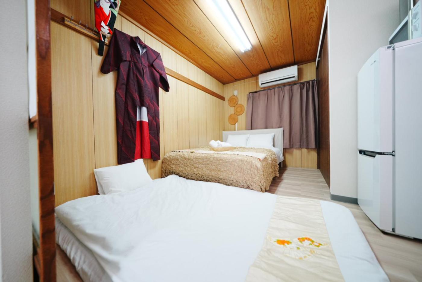 Duplex Apartment. This apartment comes with 1 living room, 1 separate bedroom and 1 bathroom with a shower and free toiletries. In the well-fitted kitchen, guests will find a refrigerator, kitchenware, a microwave and an electric kettle. The apartment features air conditioning, a washing machine, tatami along with a balcony. The unit has 1 bed and 4 futons.