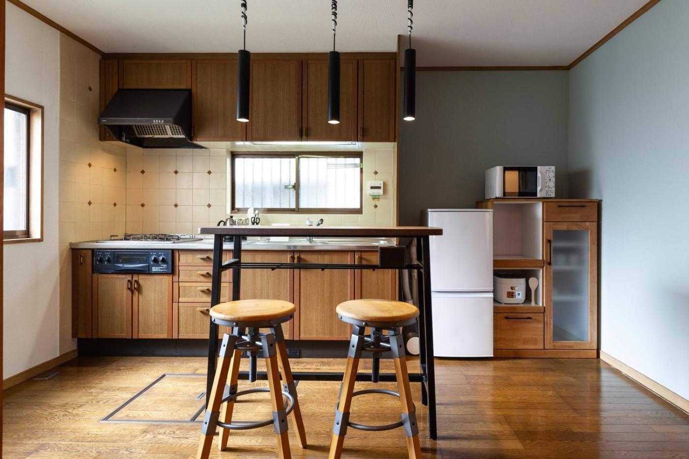 Two-Bedroom Apartment. Boasting a private entrance, this spacious apartment also comes with 2 bedrooms, a seating area and 1 bathroom with a bath and a shower. Meals can be prepared in the kitchen, which features a stovetop, a refrigerator, kitchenware and a microwave. The air-conditioned apartment features a flat-screen TV, a washing machine, tatami and a sofa. The unit has 4 beds and 3 futons.